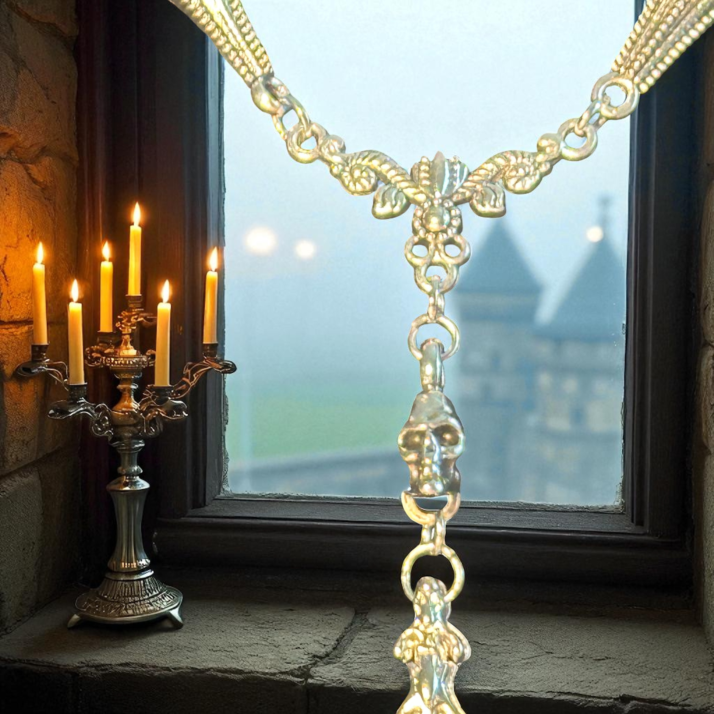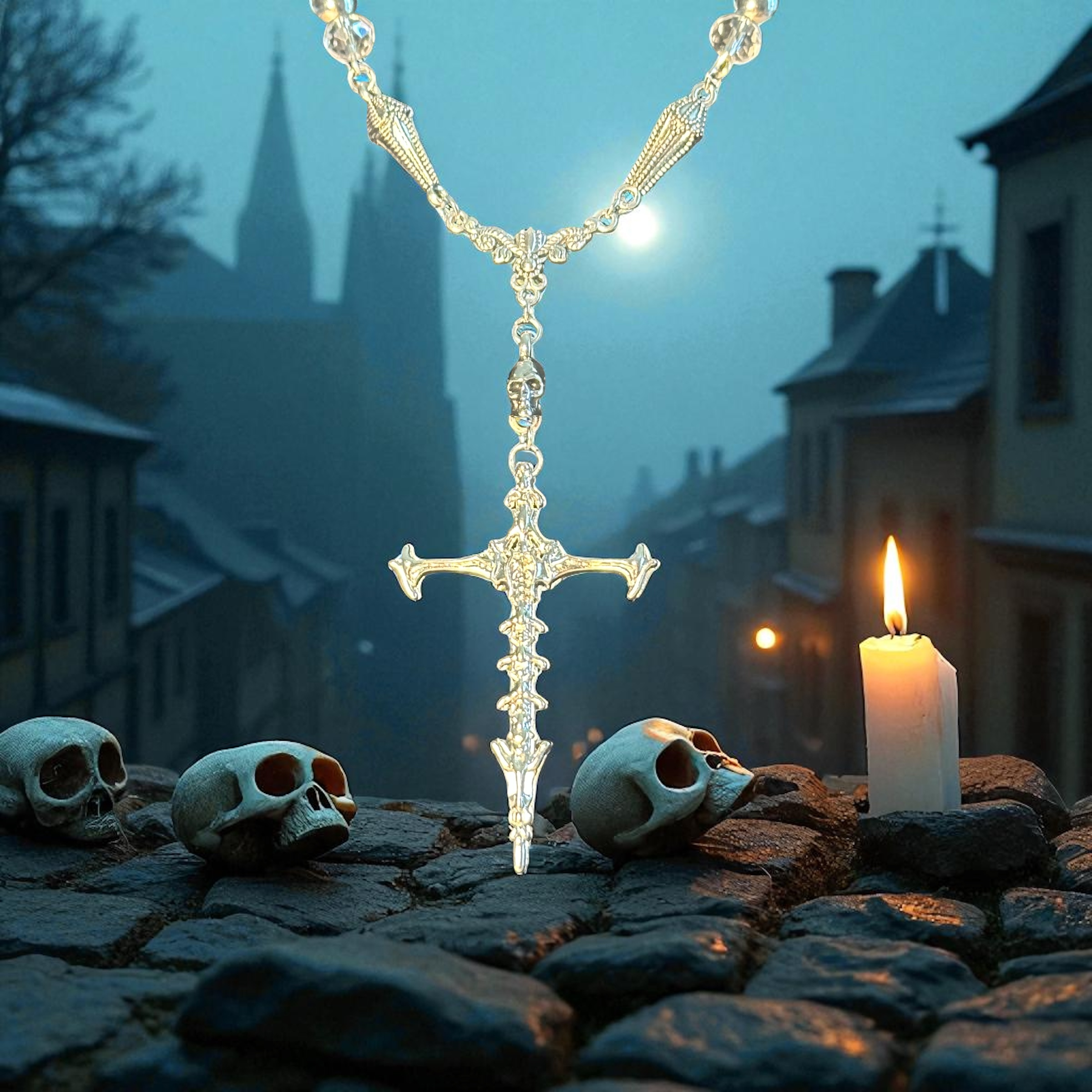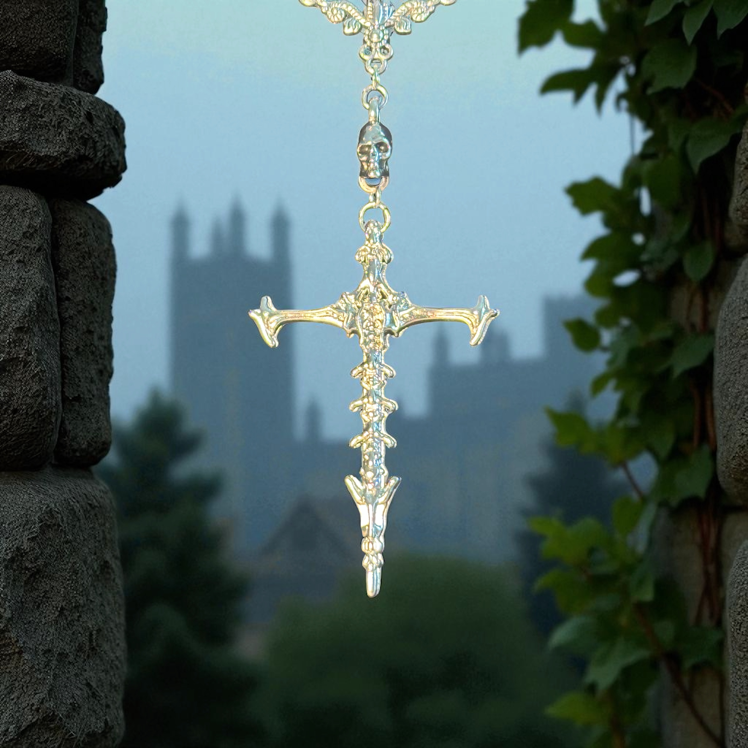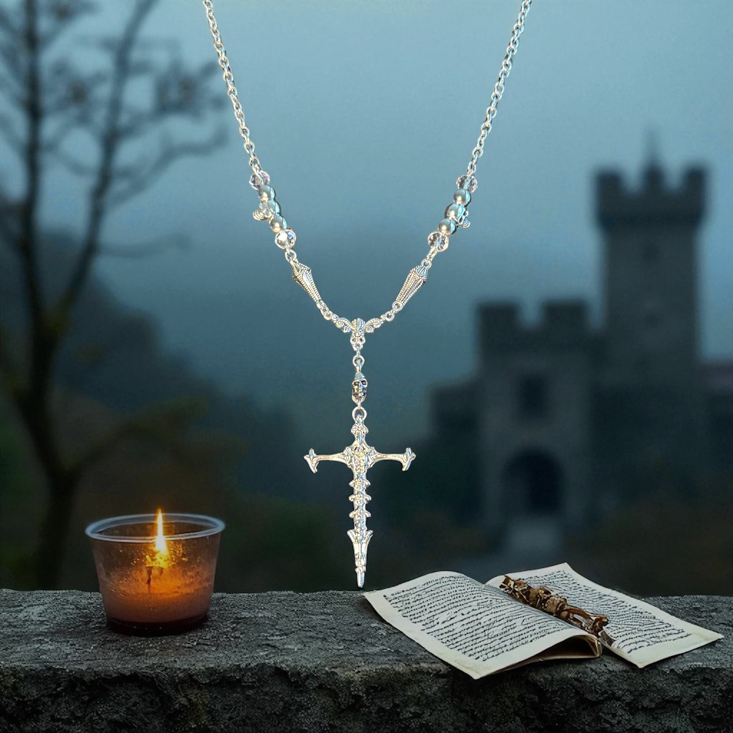 Not all treasures glitter in the sun. Forged in shadow and kissed by moonlight, this gothic cross necklace is a weapon of allure. Each jagged edge and silver curve whispers of forbidden rituals, midnight vows, and swords aged in blood. Dare to wear it, and let the world see the hunger in your heart.