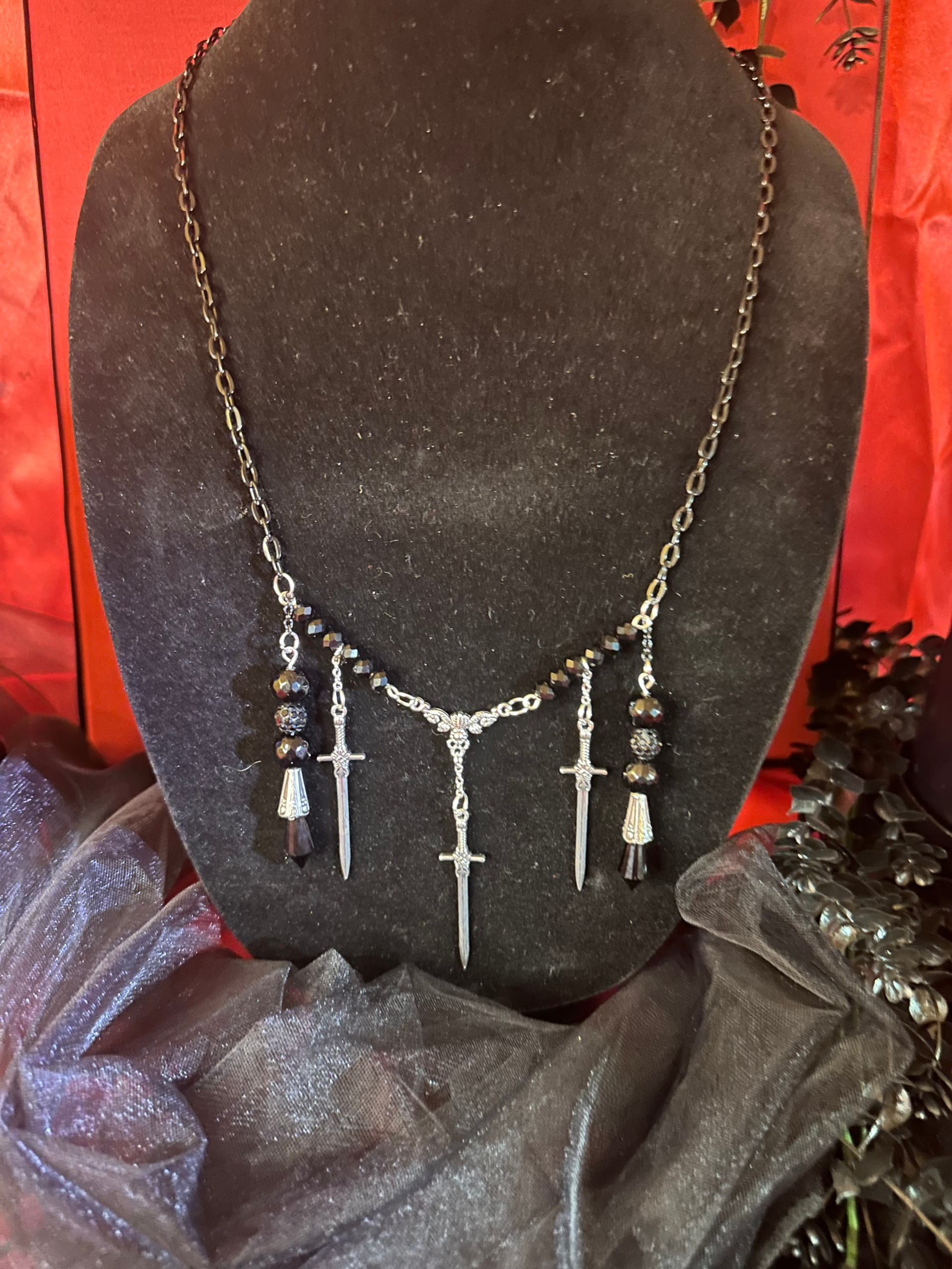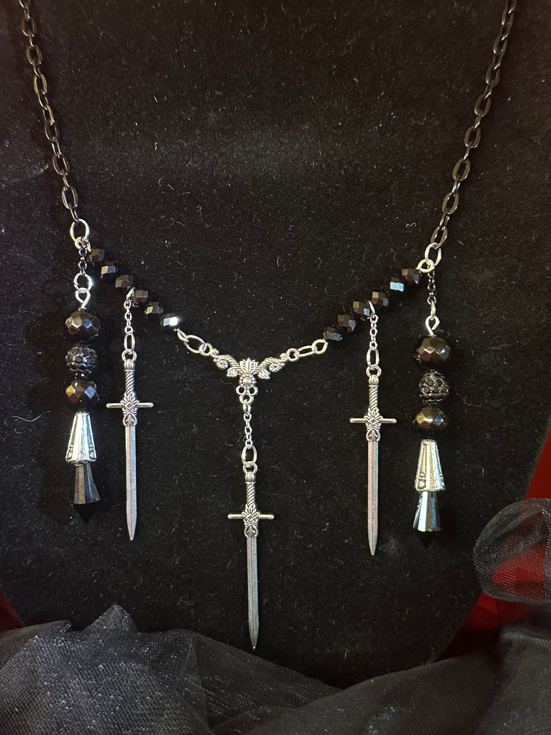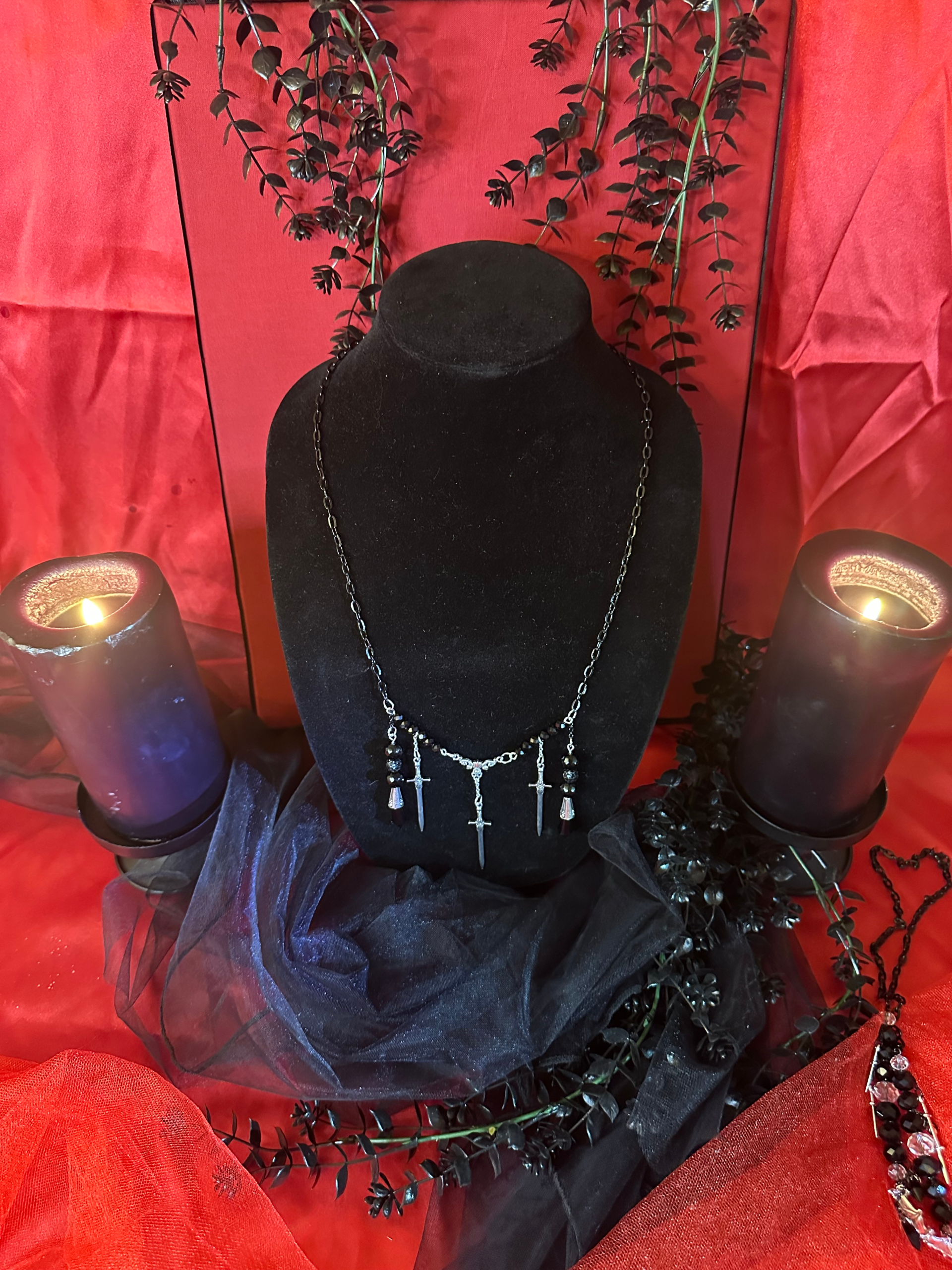 Forged in shadow, this gothic necklace drapes like a vow. Black crystal beads catch the dim light as silver spikes gleam with quiet menace. Every charm feels like a story carved in darkness: the statement of your power and beauty. Whether you’re dressing for a moonlit gathering, or a gothic ball, this piece speaks for the ones who carry dark grace in their hearts.