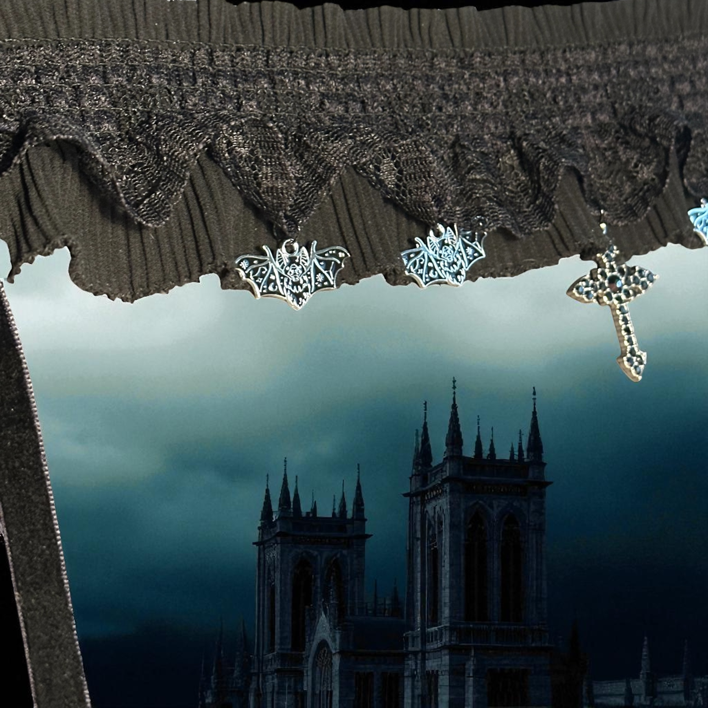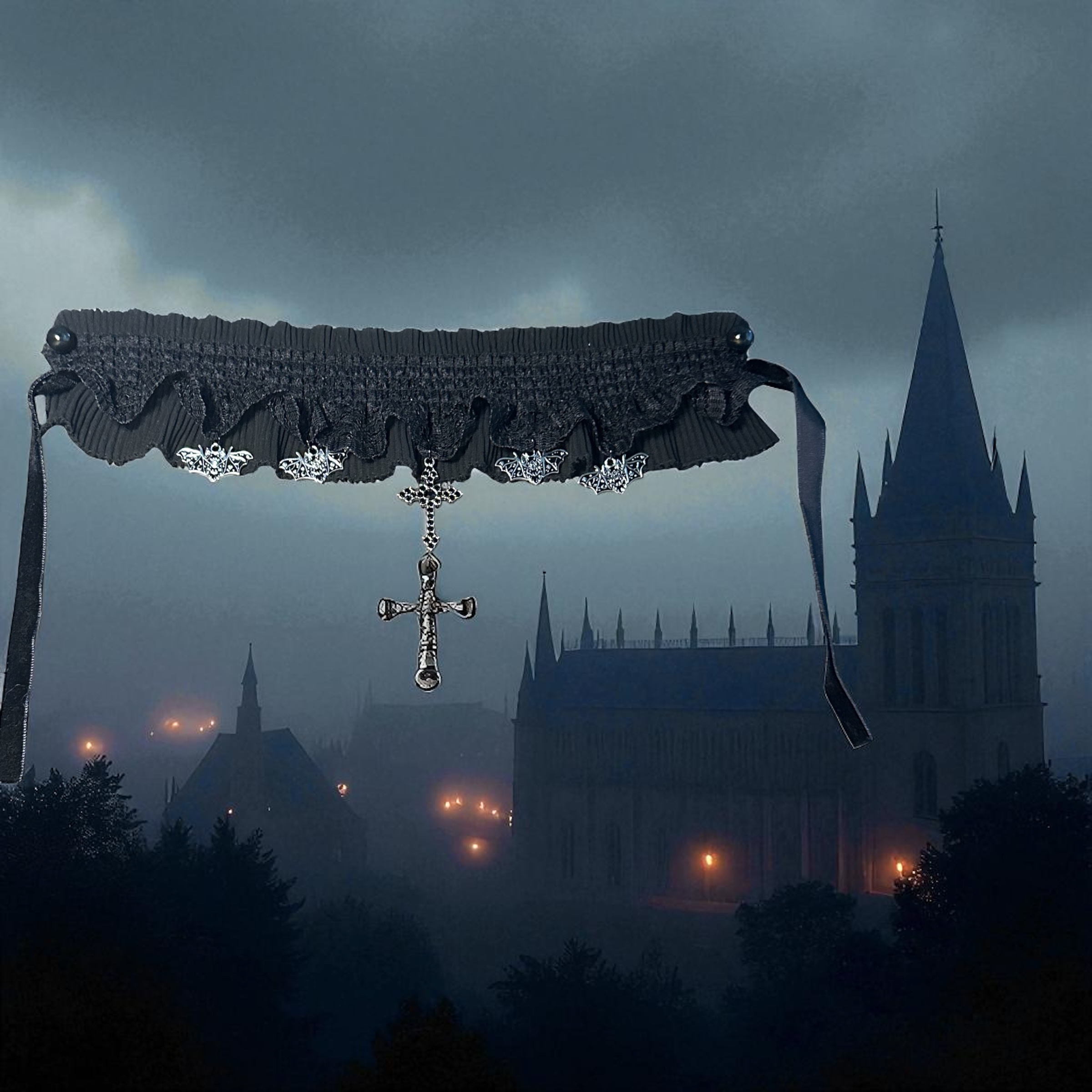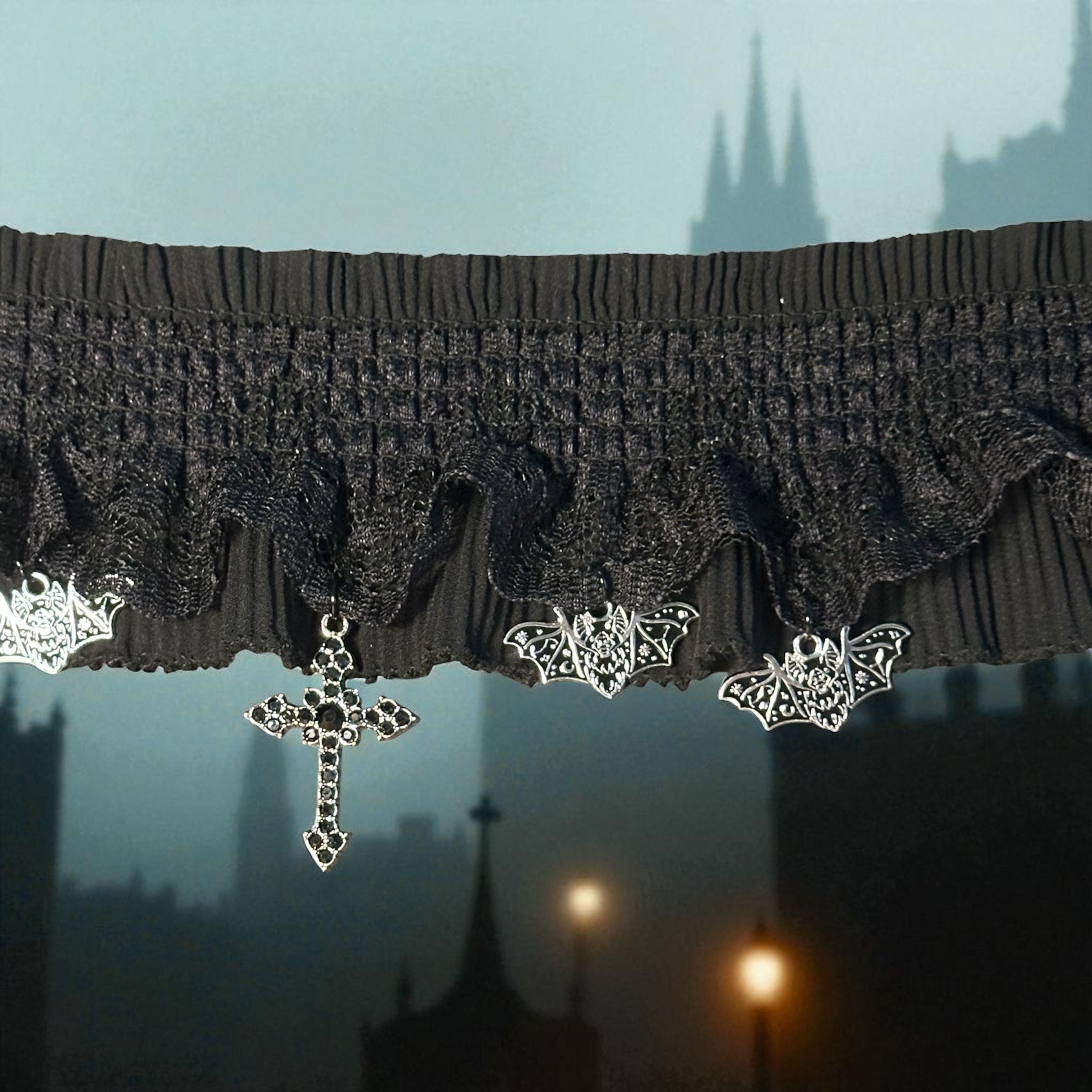This gothic choker wraps your neck in dark romance. The band, made of ruched black lace, frames the neck with soft Victorian drama, while black and silver bats spread their wings like silent guardians of the night. At its heart, a black rhinestone cross glimmers with quiet reverence. The final touch, velvety ribbon to tie it at the back. Perfect for Gothic Lolita ensembles, this piece balances innocence with allure—delicate enough to pair with frills and ruffles, yet bold enough to command attention on its own. Adorn yourself in elegance from Hollow Hills Gothic.