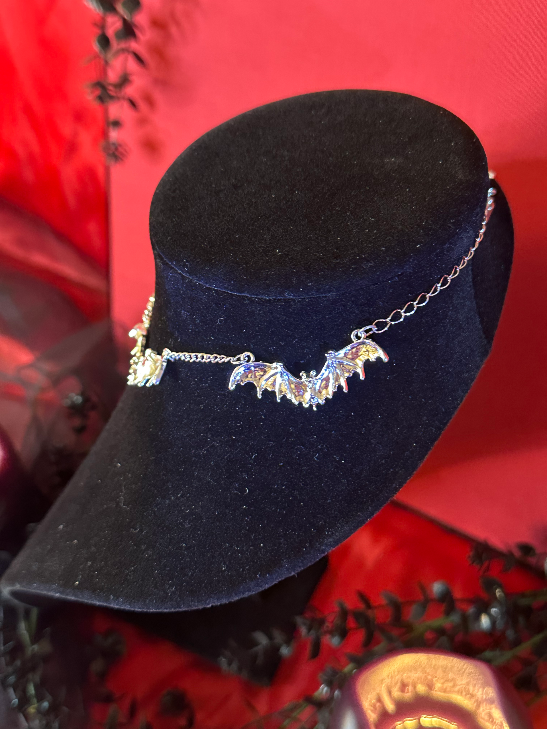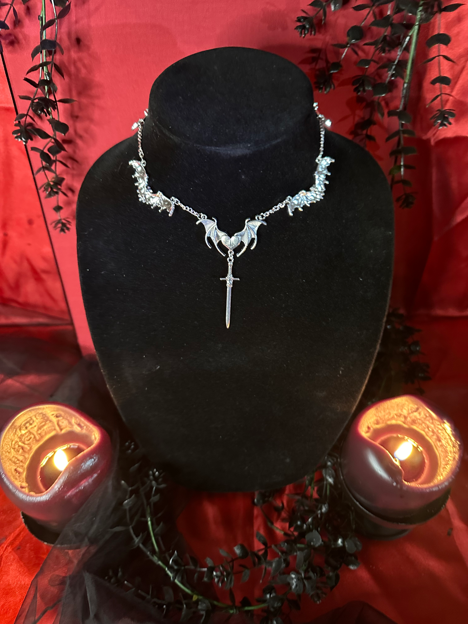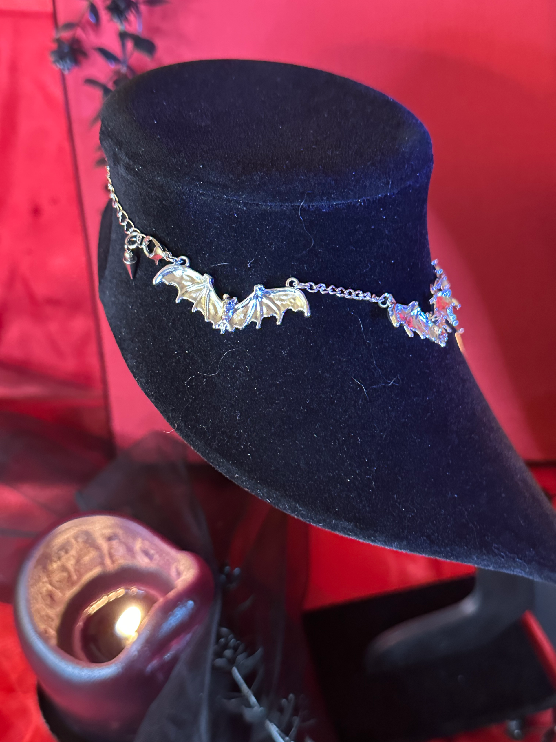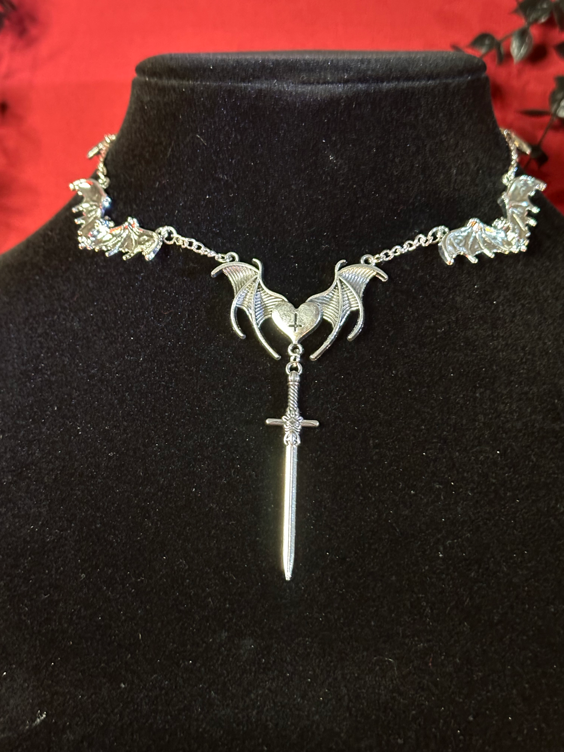 Unleash something wicked. “I Bathe In Their Venom” isn’t just a choker—it’s a declaration. Silver bats circle your throat like loyal creatures of the night, guarding a heart stitched with shadowed intent. From its center, a blade drops like a whispered threat, gleaming with the promise of beautiful danger. Wear it when you want the world to wonder what you’re capable of. Wear it when you’re ready to sink your fangs into the night and make it yours.
