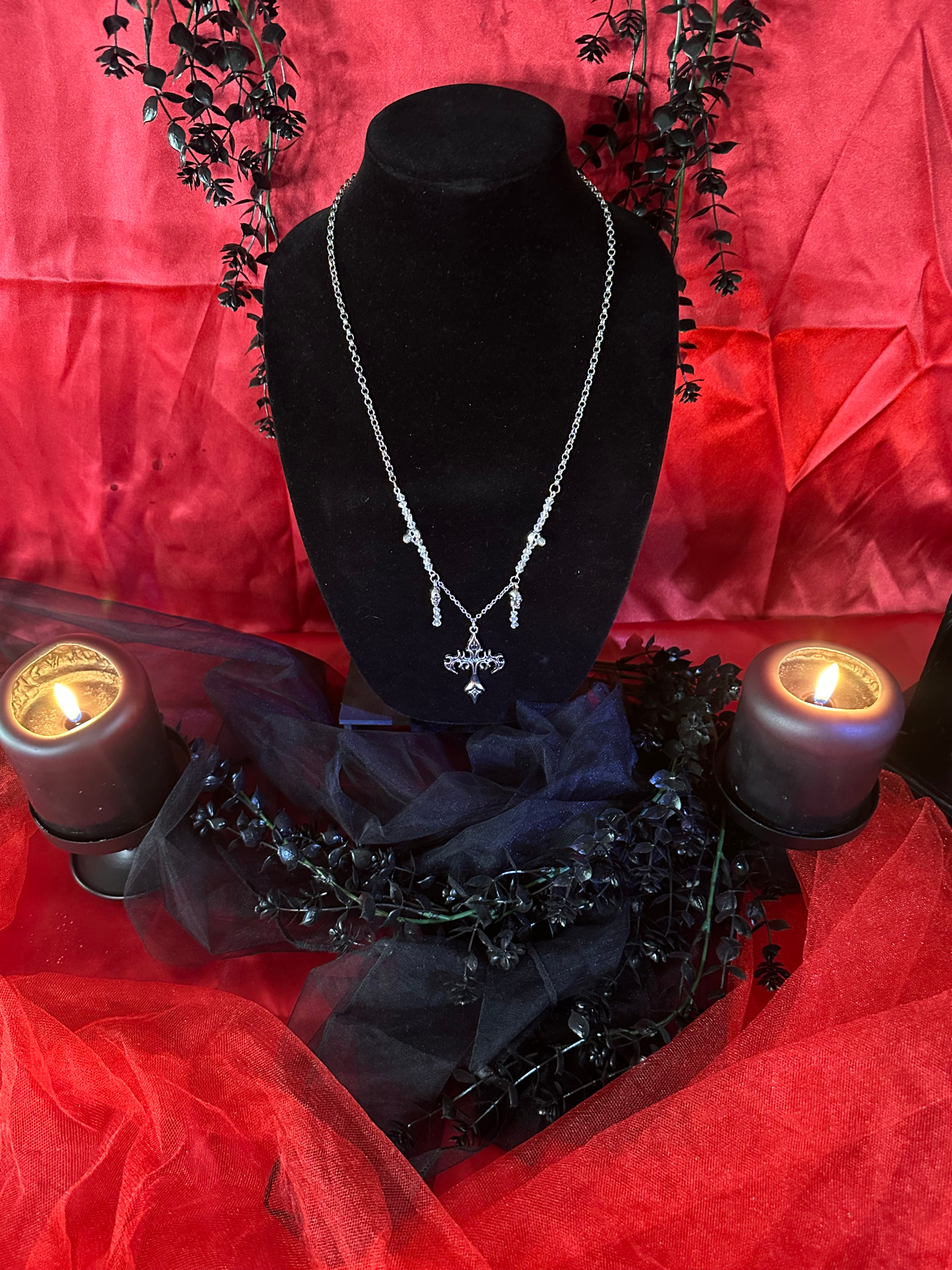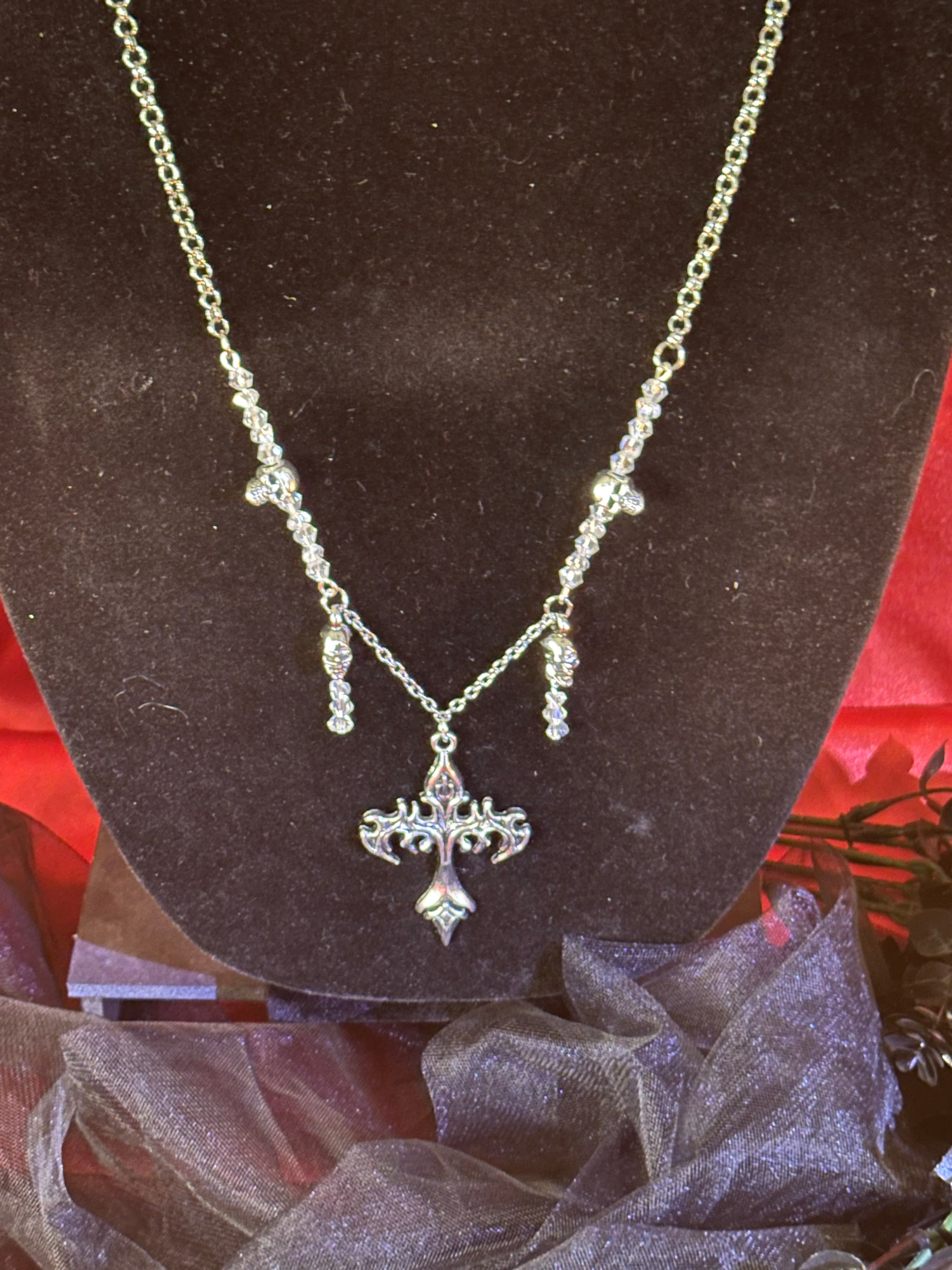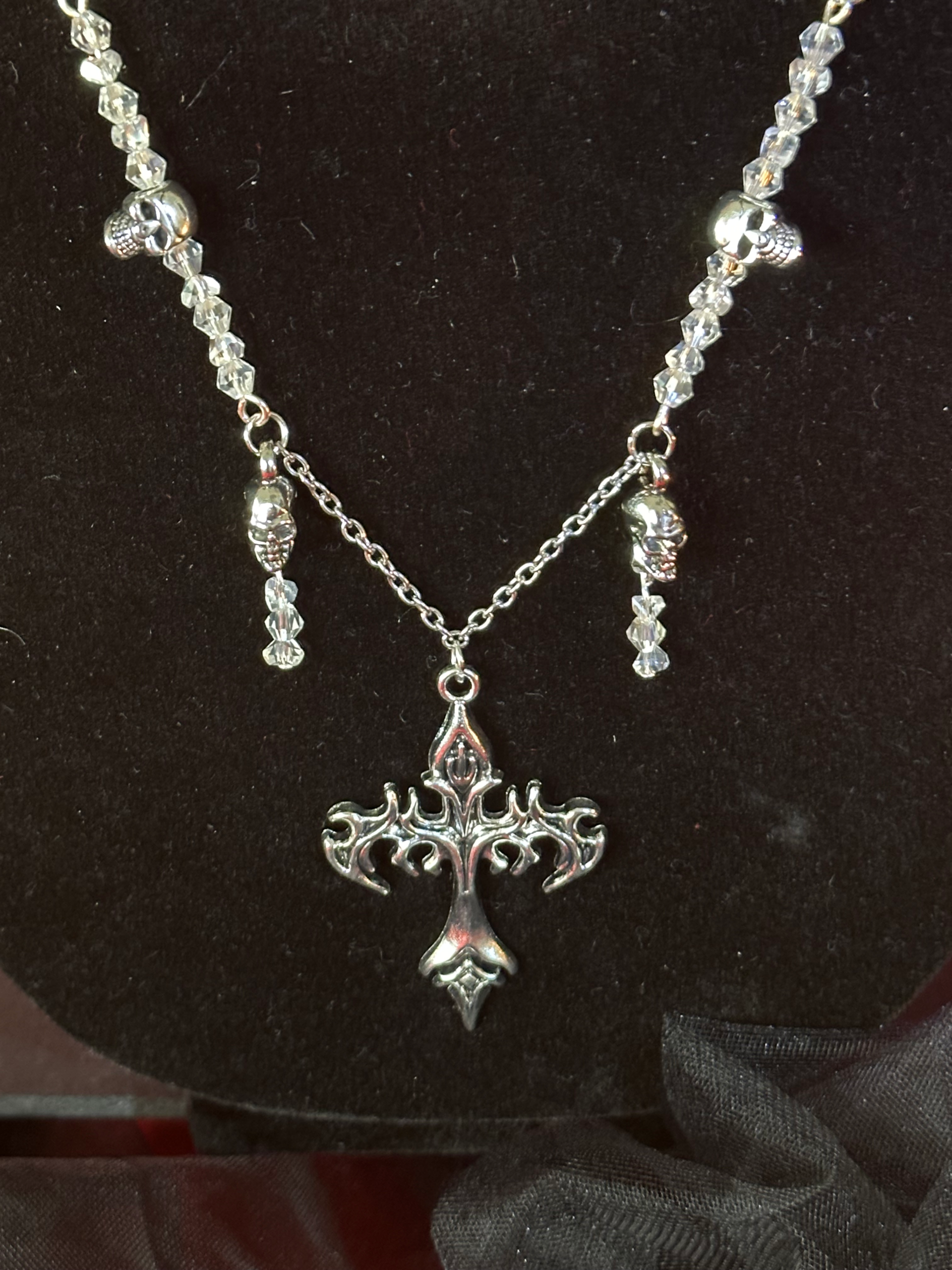 Silver as pale as moonlight coils around you, crowned with four skulls that keep silent vigil. At its heart, a flame-shaped cross burns with forbidden desire, while clear glass crystals glimmer like drops of stolen starlight. This necklace is not mere adornment—it’s a promise to the night. A symbol for those who walk between passion and peril, beauty and blood.