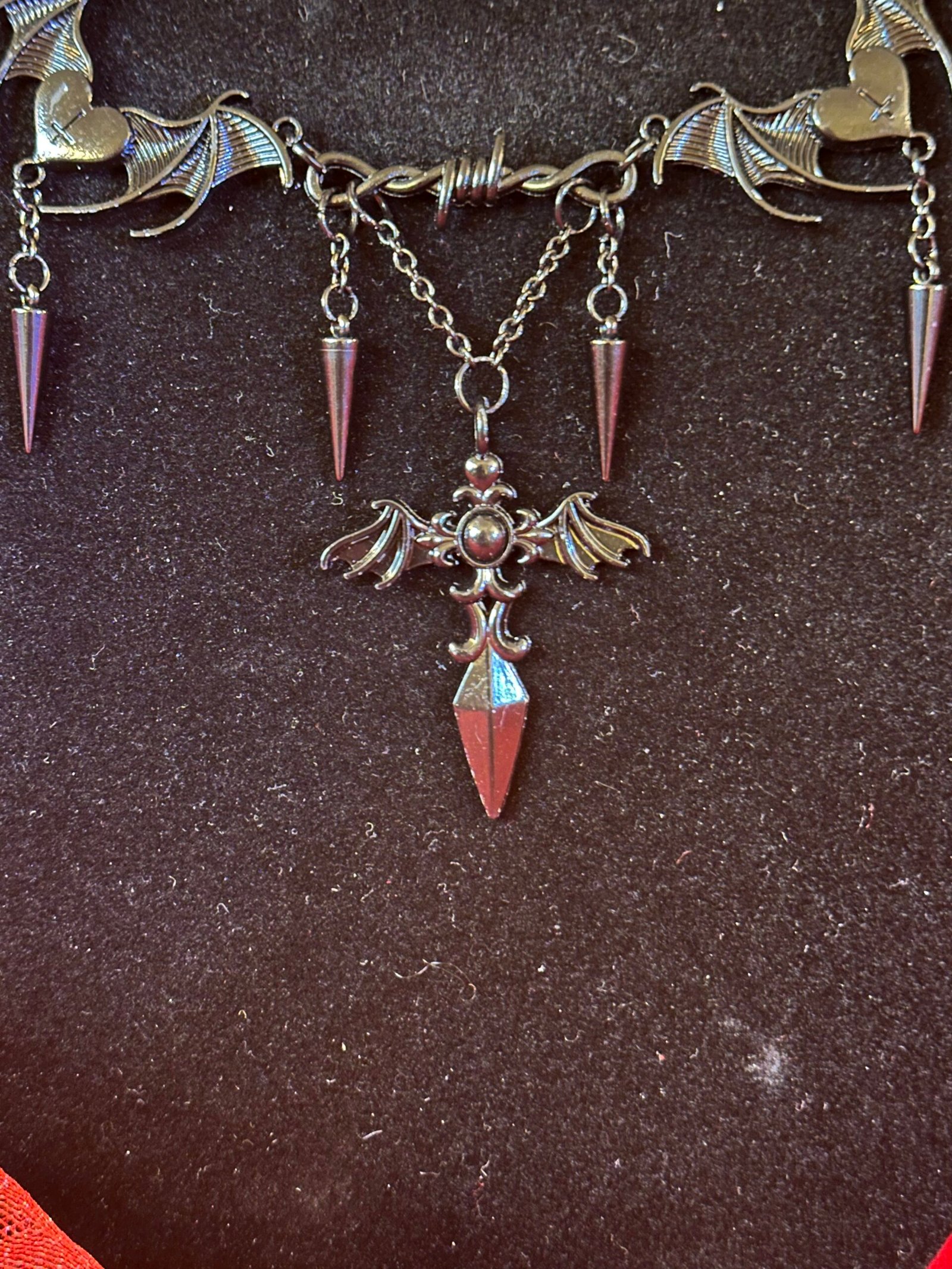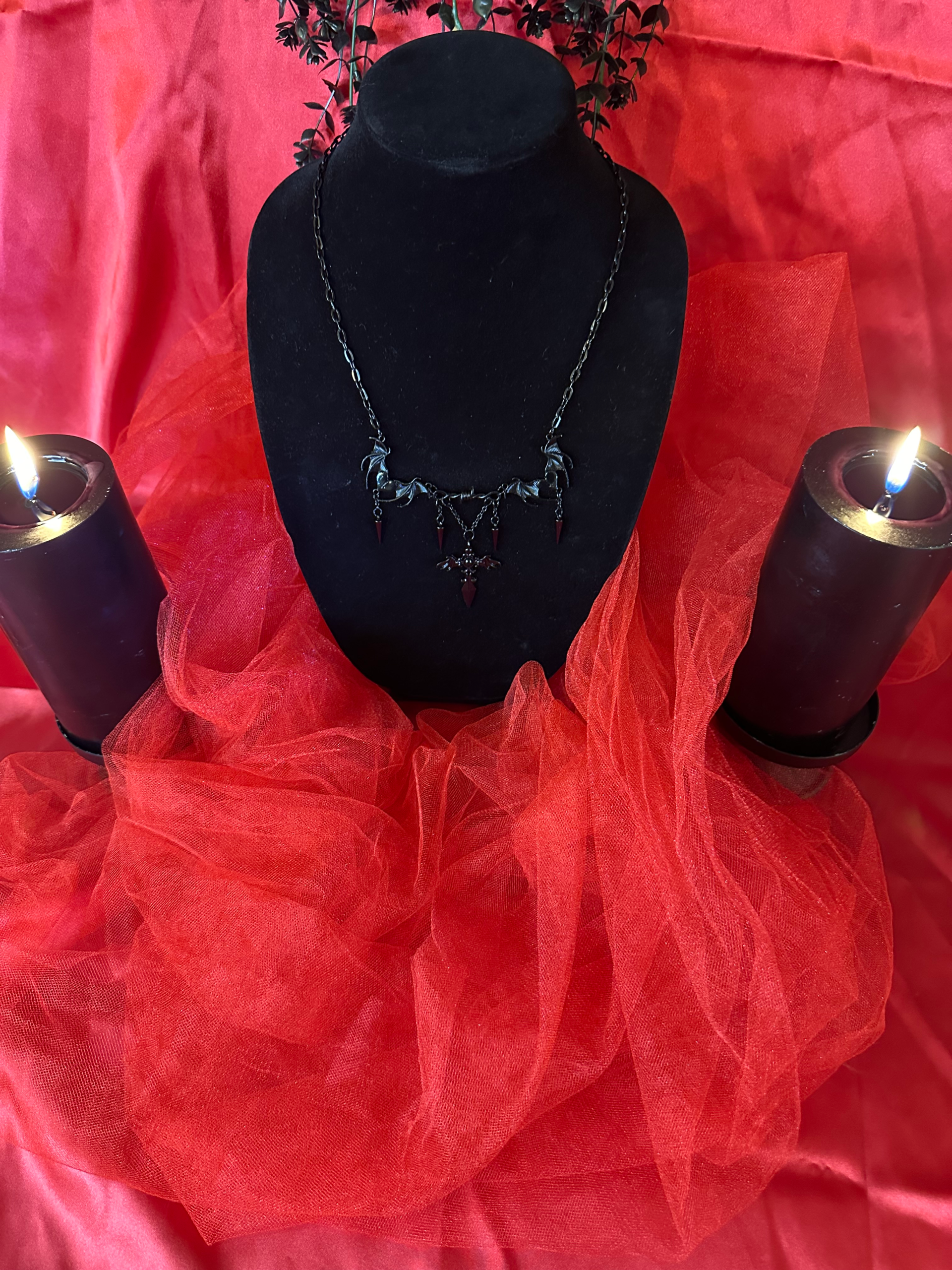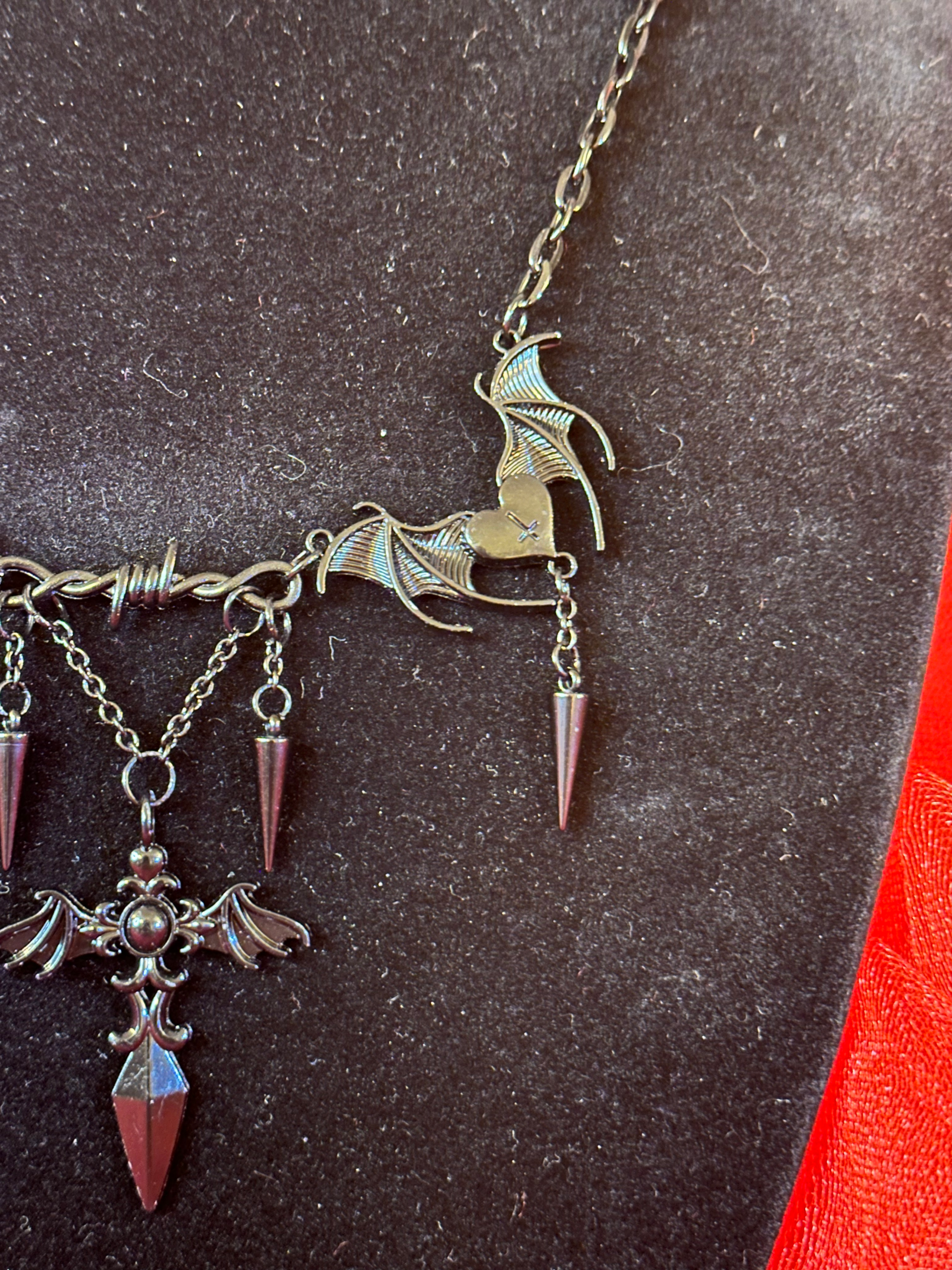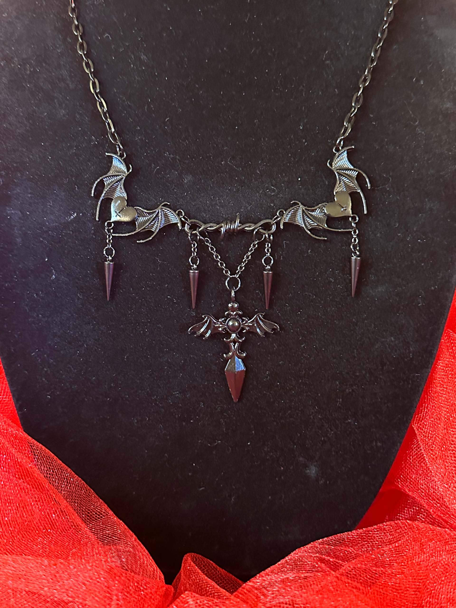 If You Need A Reason To Wear Black… this necklace is it. Forged in shadow and intention, “If You Need A Reason To Wear Black” rests upon your throat like a quiet threat. Bats curl around black spikes as chains drape and pull. The entire piece is deliberate and dangerous, as if the necklace itself chose you. Wear it to state your pact with the darkness, knowing that beauty never needs permission. Dress like the villain and be the reason they look away first, but are then captivated by you.