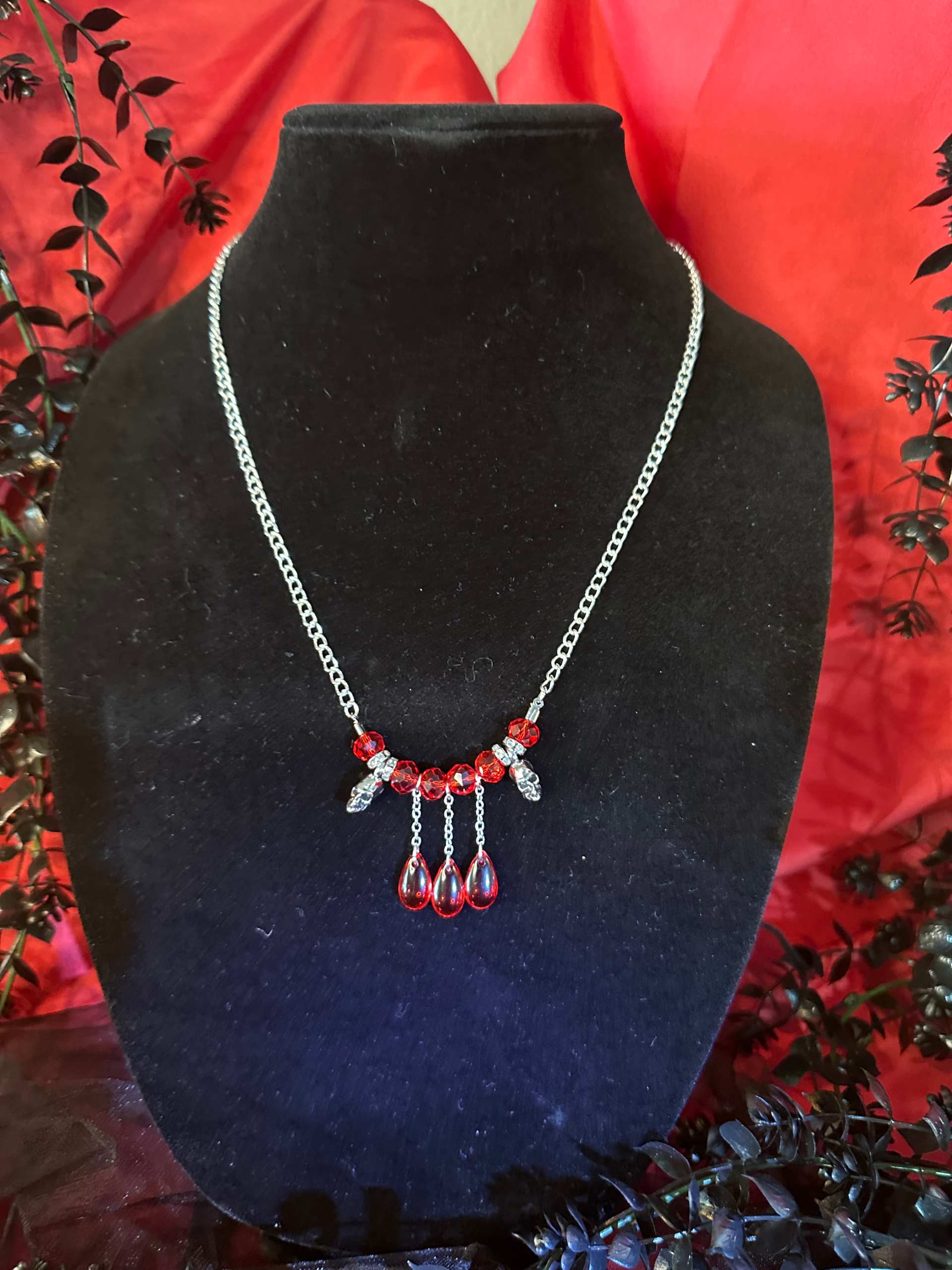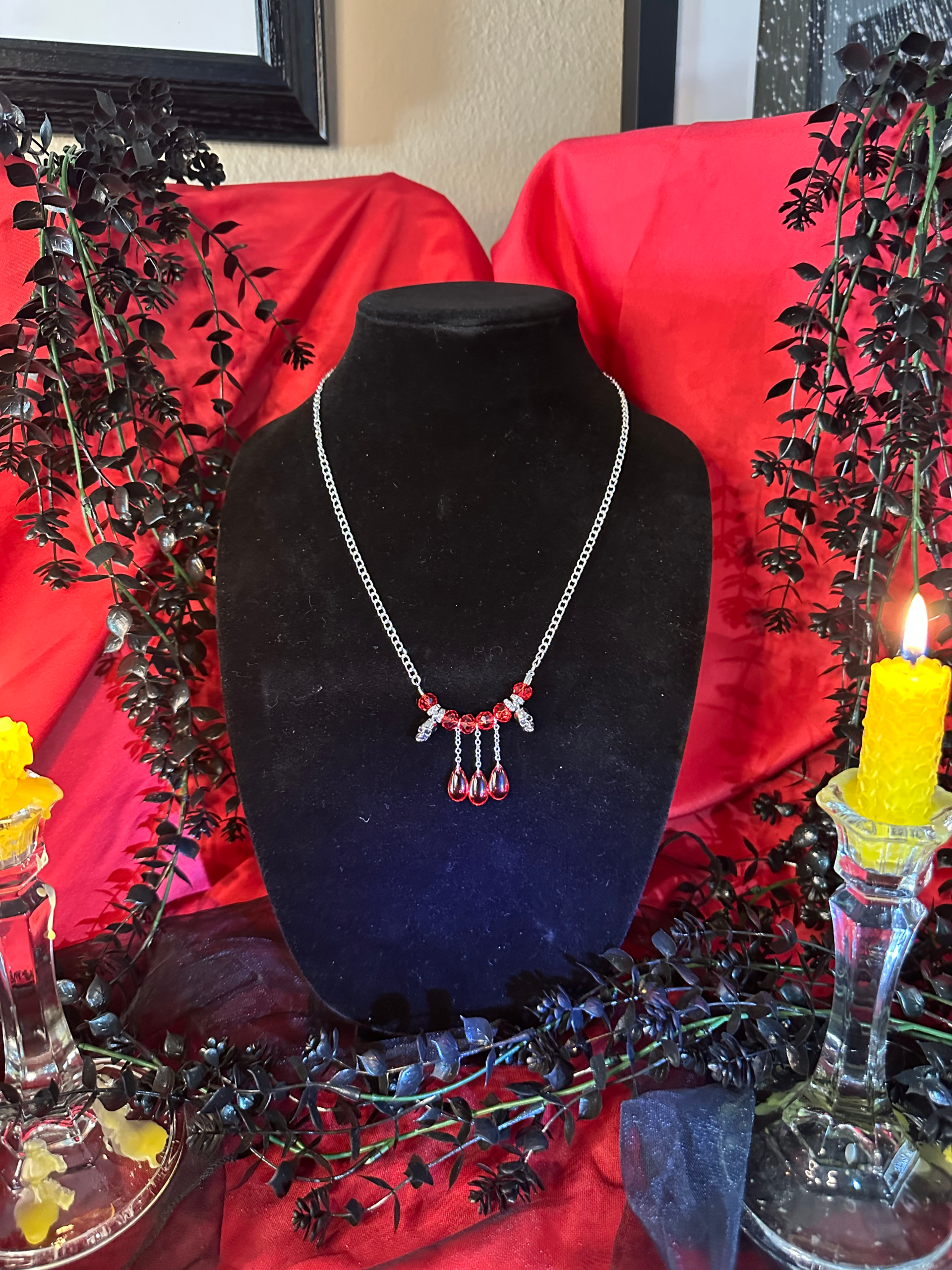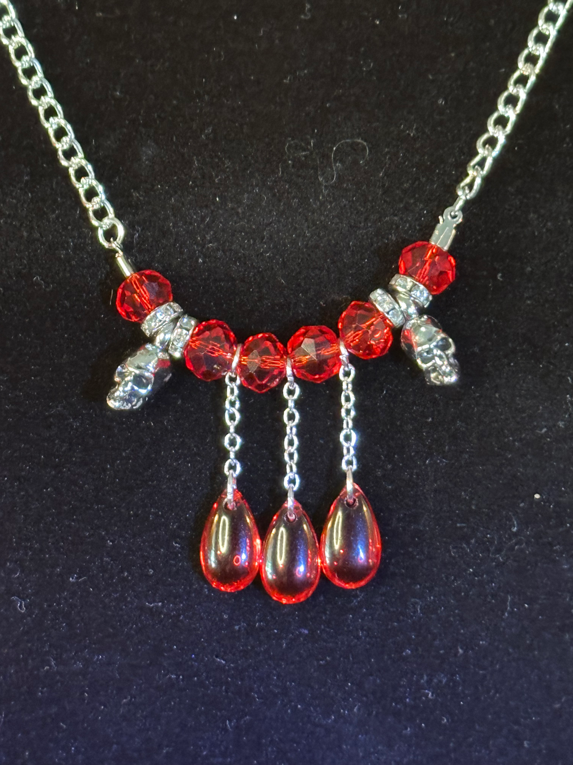 This 21″ gothic necklace will adorn you like no other. Blood red beads surround two guardian skulls as three silent tears of blood drop from its center. Yes, it’s just a kiss of blood, but it kisses you as you step into the night to rule it.