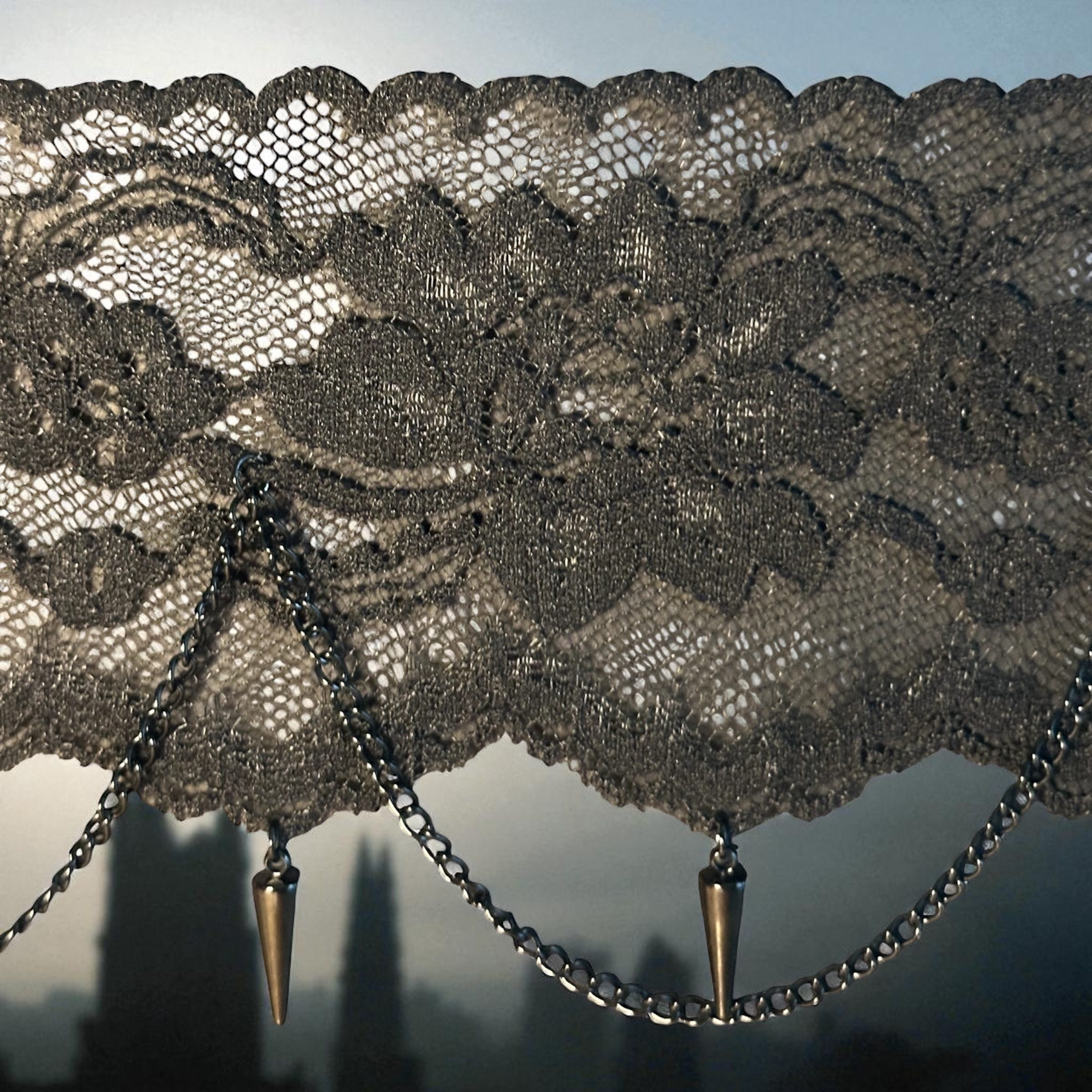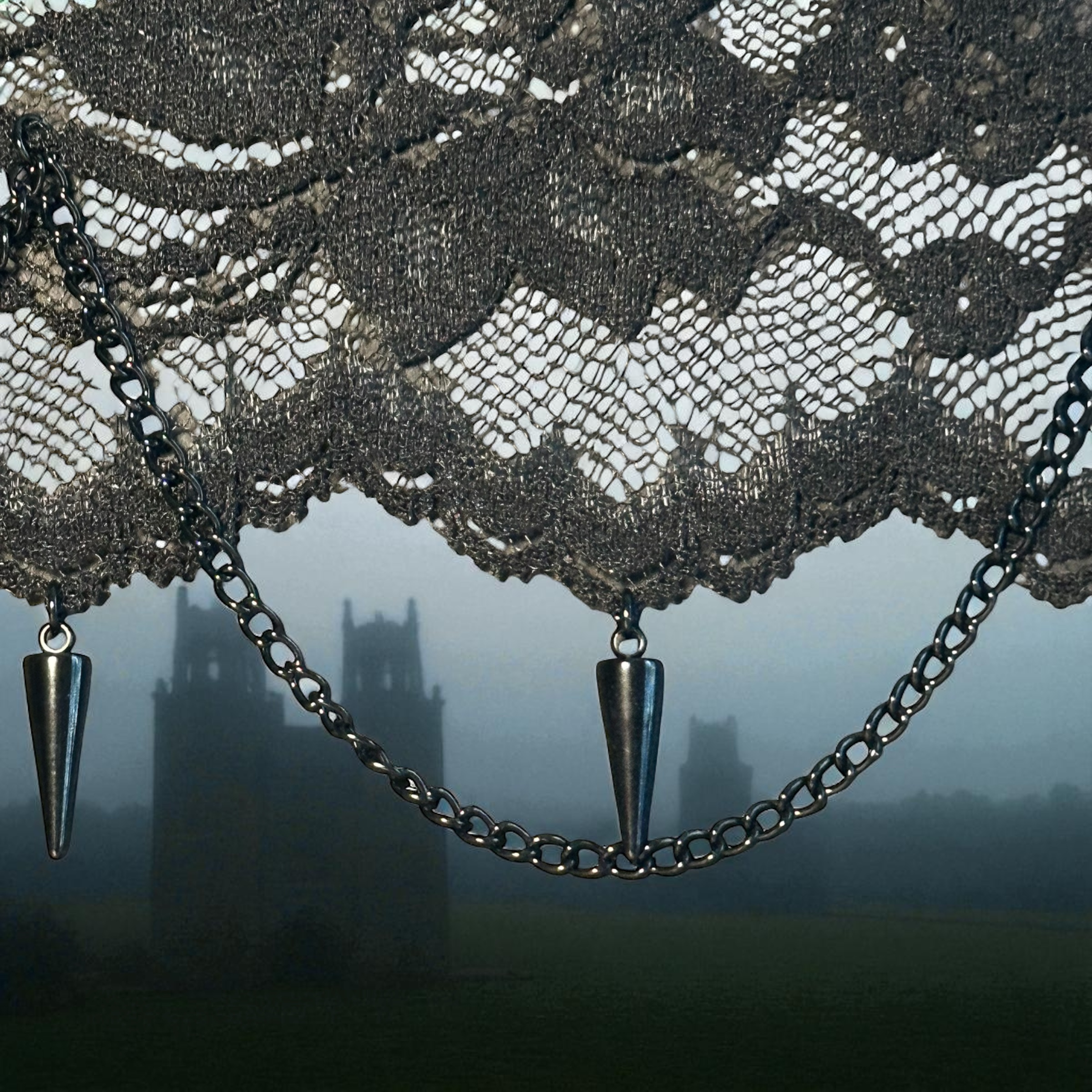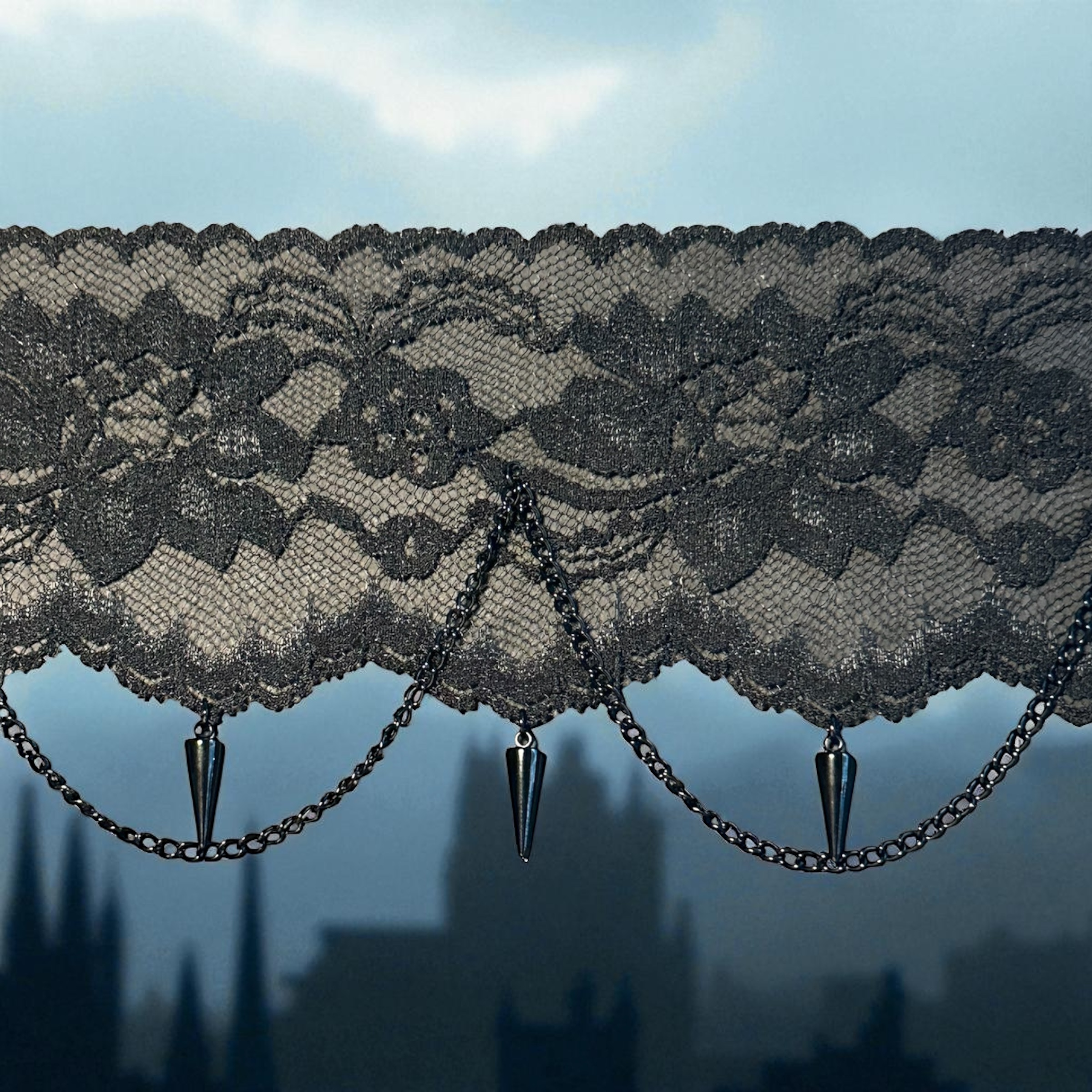 Dare to Embrace the Darkness. This gothic lace choker fuses elegance with edge. Delicate black floral lace holds draping black chains and sleek black spikes. Whether for a night out, or daily wear, it’s a bold statement of the gothic aesthetic and the perfect statement piece to channel your inner mystery.