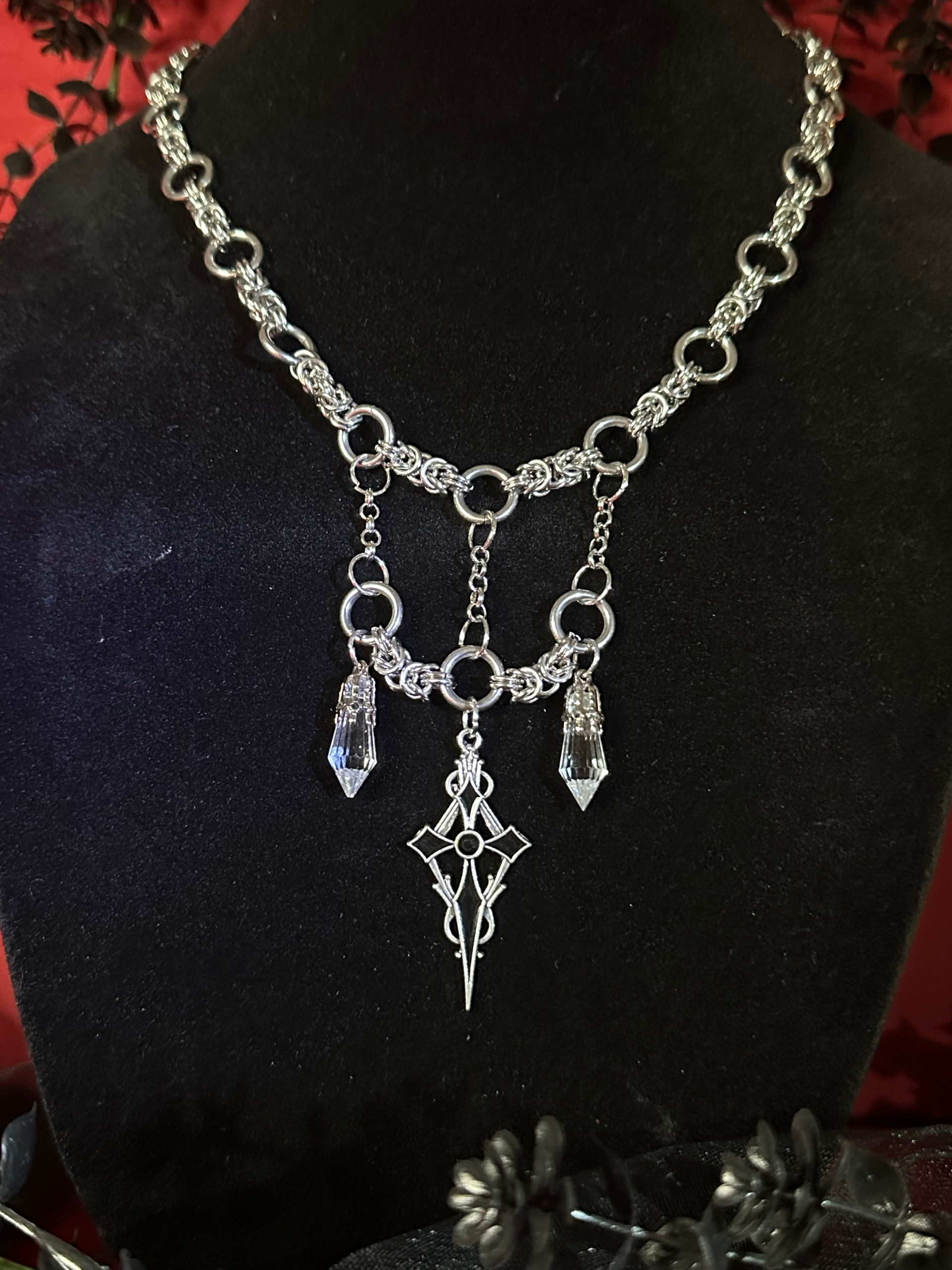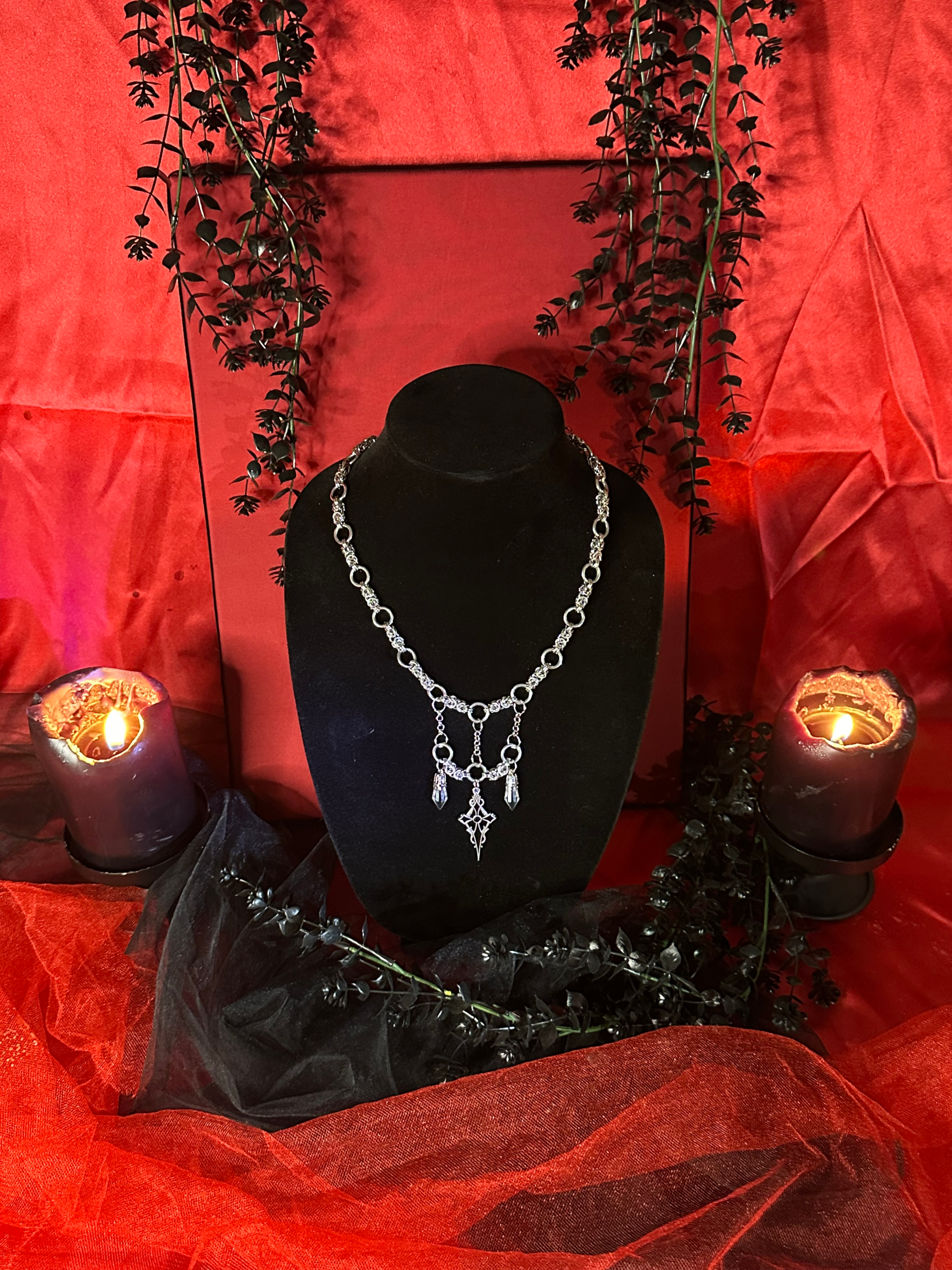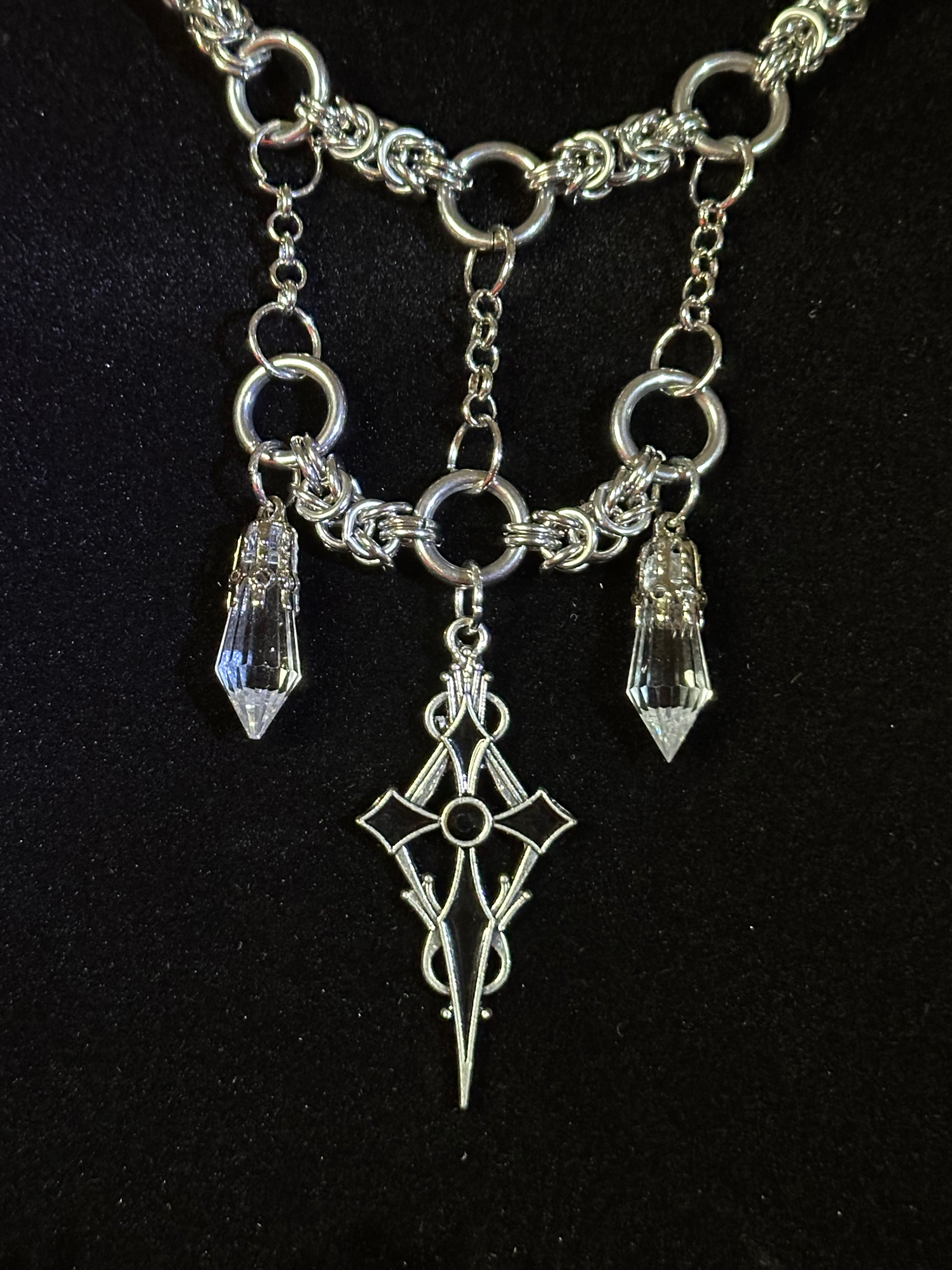The night was made for souls like yours; mysterious and powerful, yet ever longing for love lost. The moonlight catches your inner beauty like the sun never could and so the shadows are your realm. Rule your darkness in this beautiful necklace of knotted chain that rests upon your chest like the remembered touch of a lover long lost. Crystal beads hang like tears, embracing a gothic dagger cross, the symbol of your devotion to the night, and the night’s devotion to you.