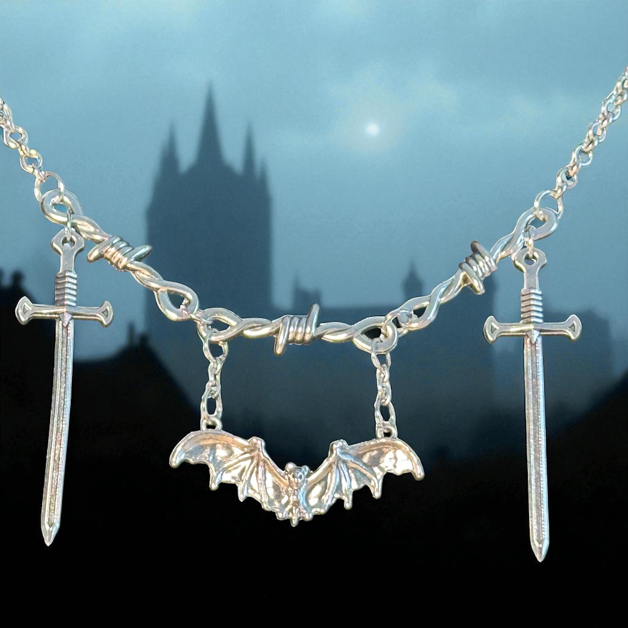 Beneath the velvet veil of night, desire takes form in steel and shadow. This is adornment with a message for those unfamiliar with life in the shadows. A metallic chain coils at your throat, linked by razor-edged barbs, as twin blades hang poised in devotion, framing a midnight bat that rules as both guardian and temptress.