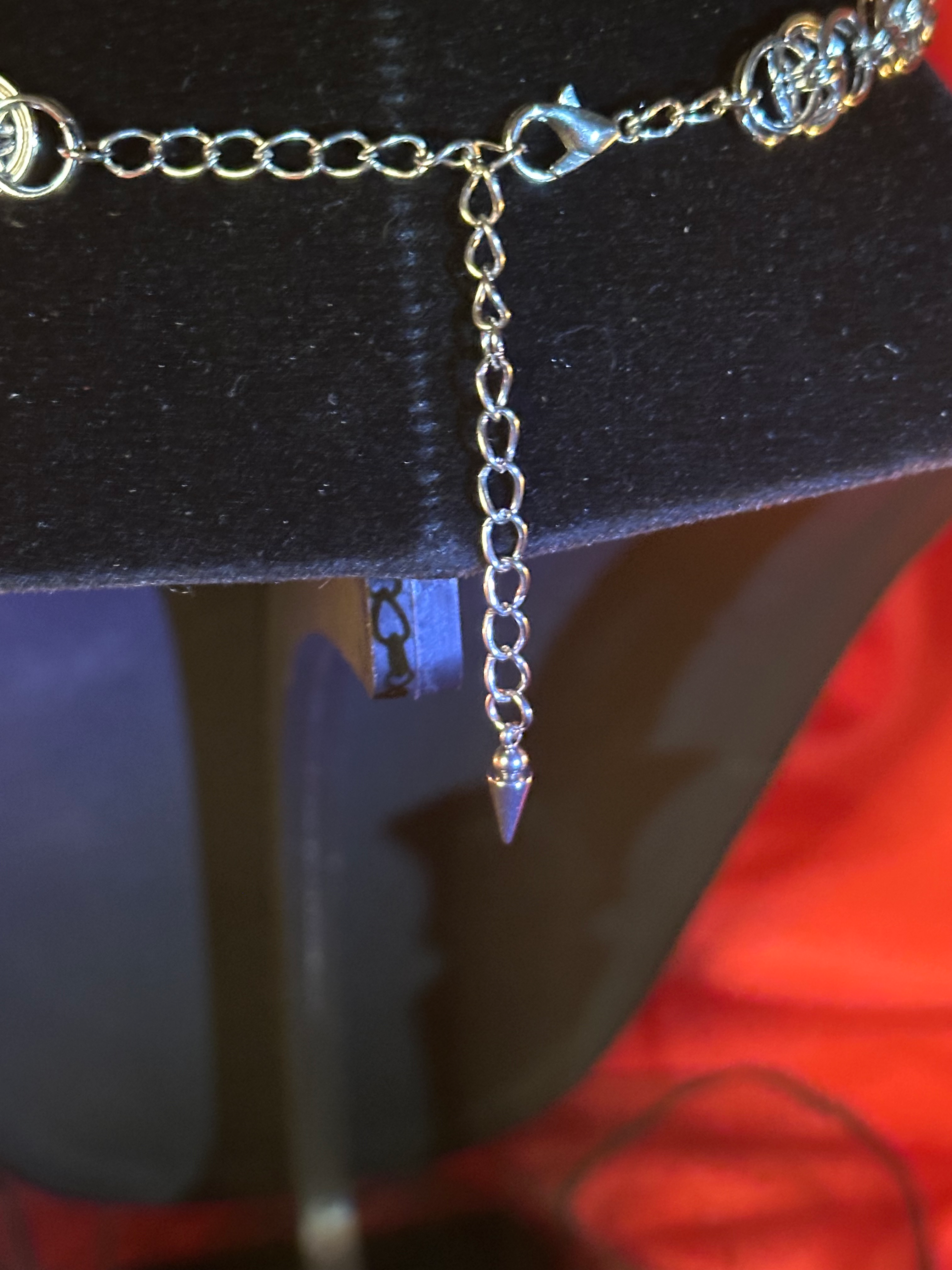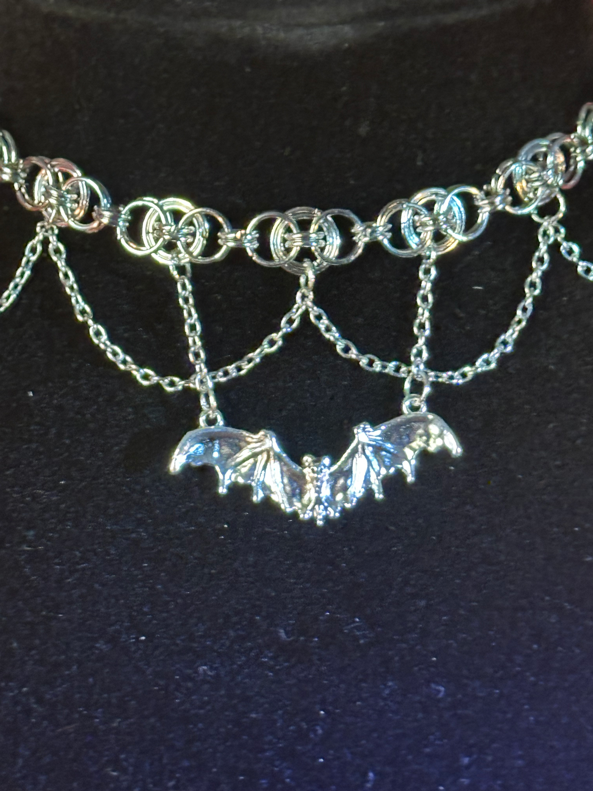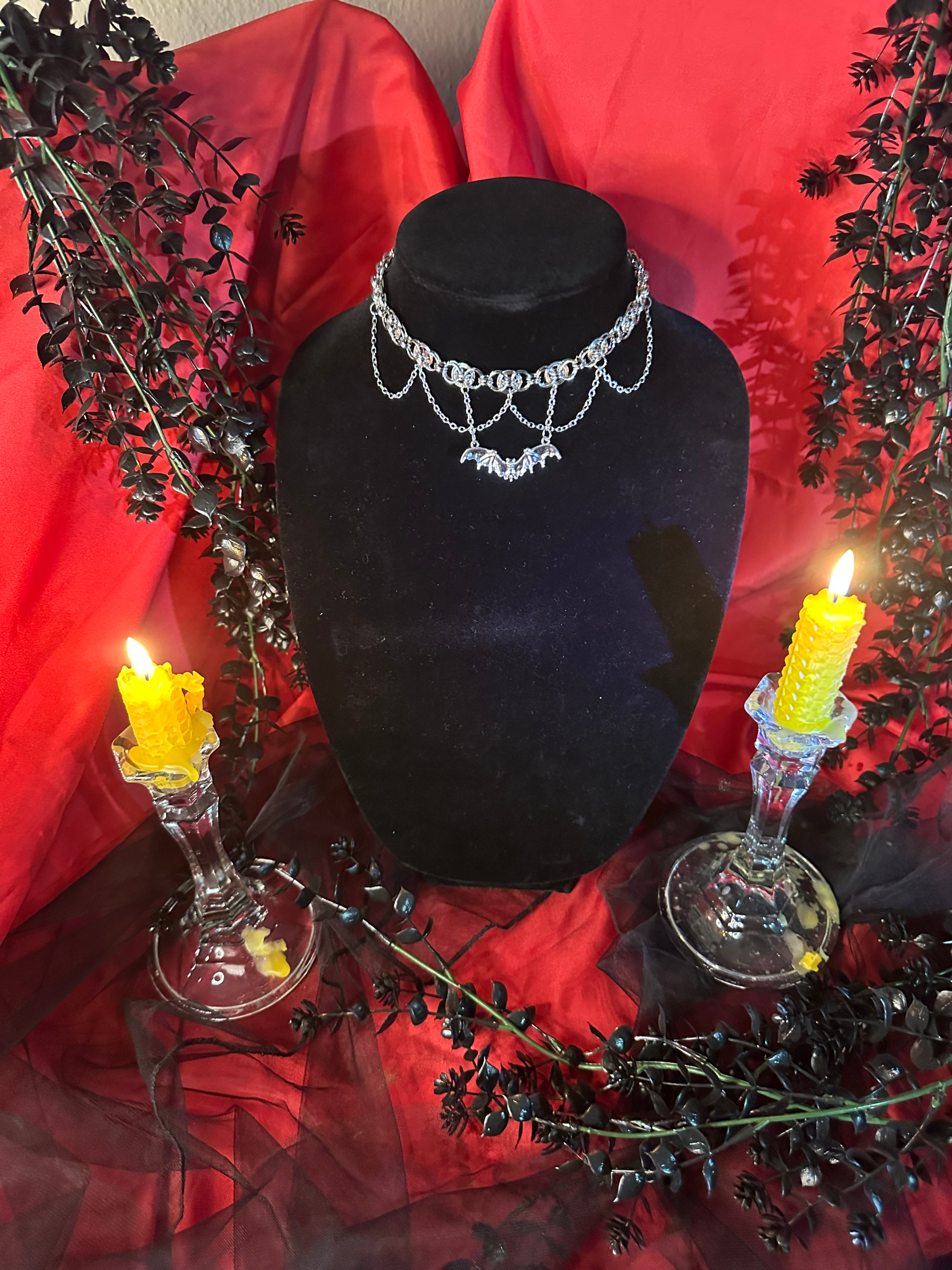 You thrive after dark, so let the world make no mistake when you arrive. The chains of the night grace your throat, crowned with a bat in full flight and ready to strike. Its chainmail elegance is crafted for creatures of the night. Slip it on, and let the world see the predator behind your eyes. Of course, the adjustment chain is topped with our signature spike.