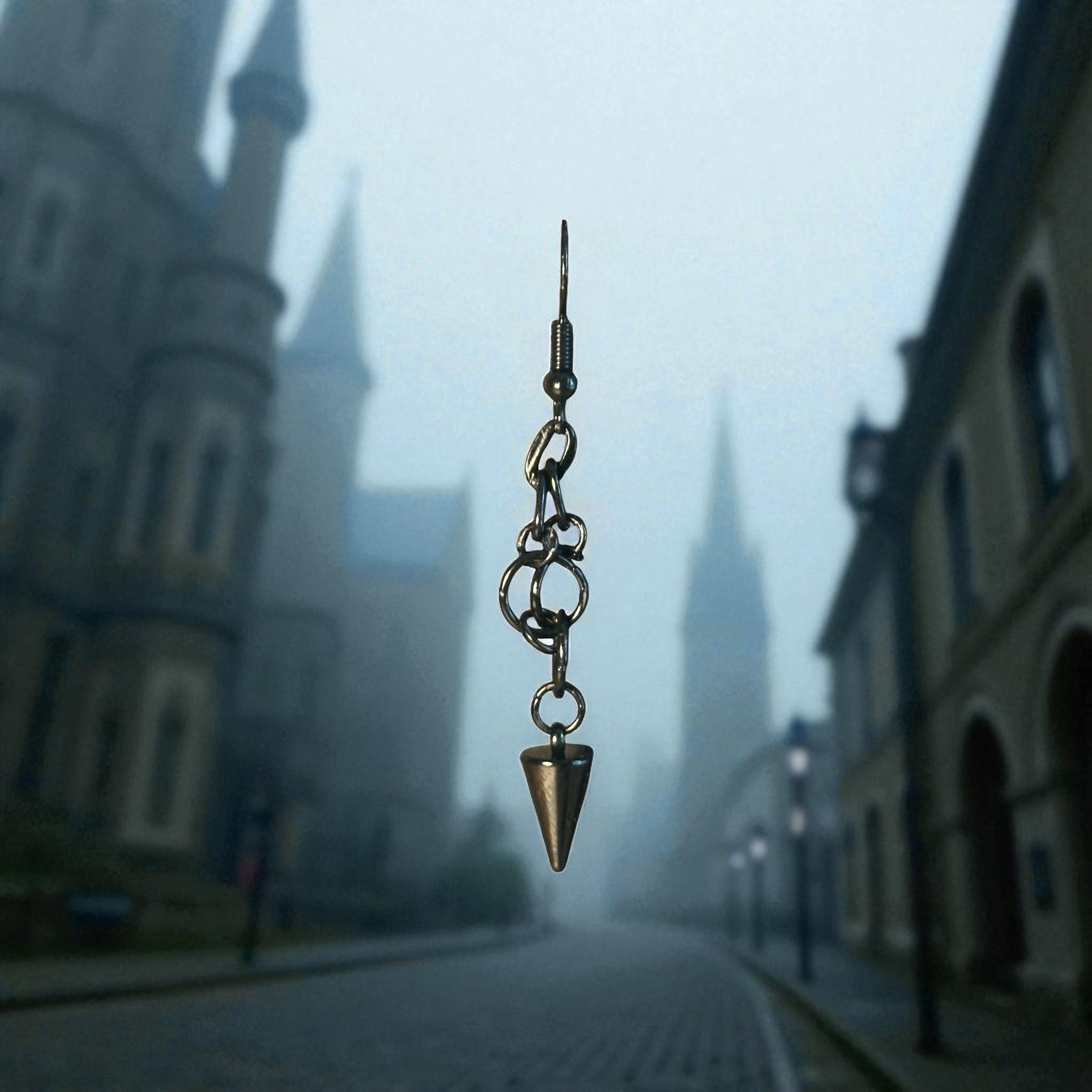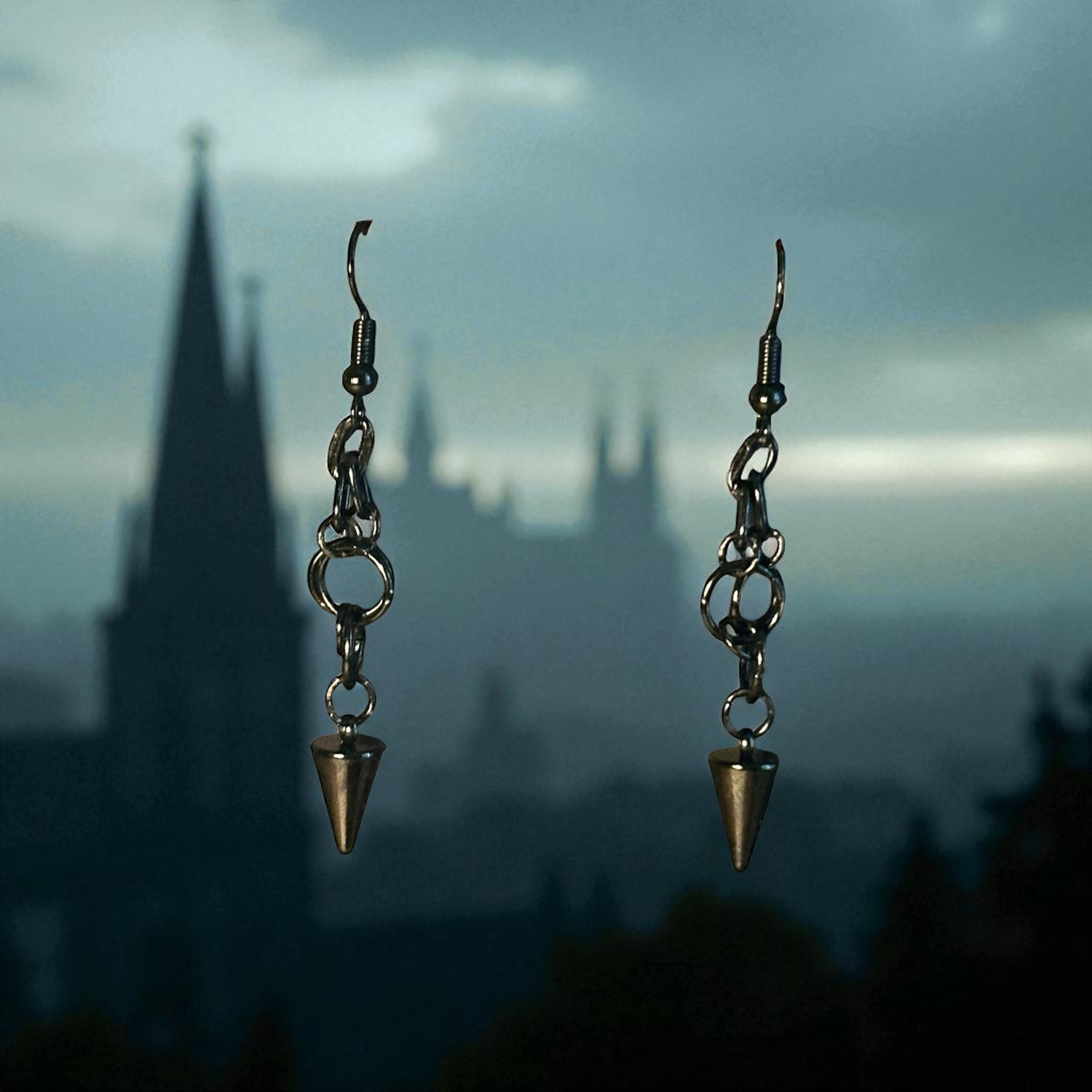Rule the night in these crossover, Goth / Punk earrings. A jumble of rings hangs from a chain, with a black spike at the bottom. Perfect for concerts, or whatever ritual you have planned, these are a pair of statement earrings, that let the world know your unique style.