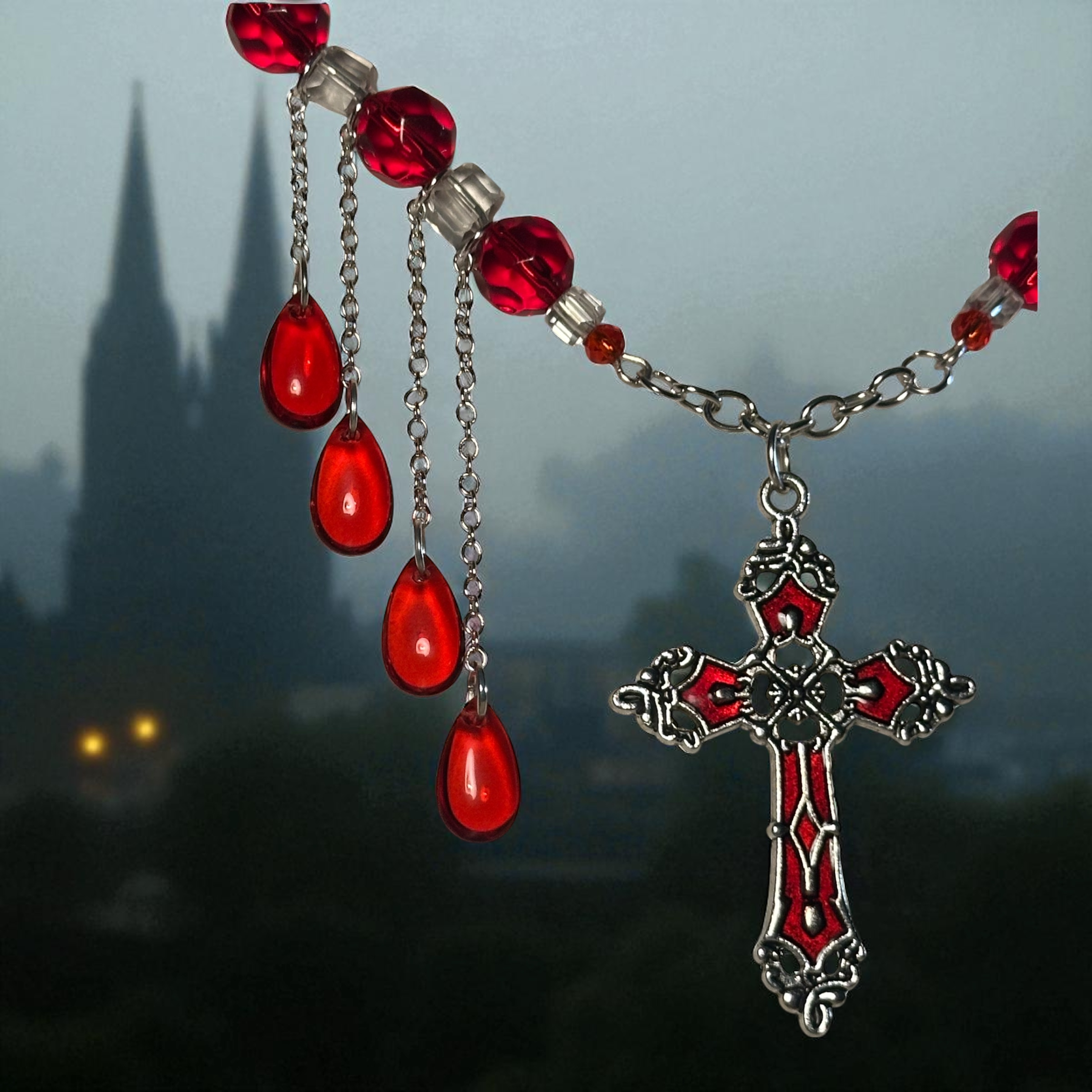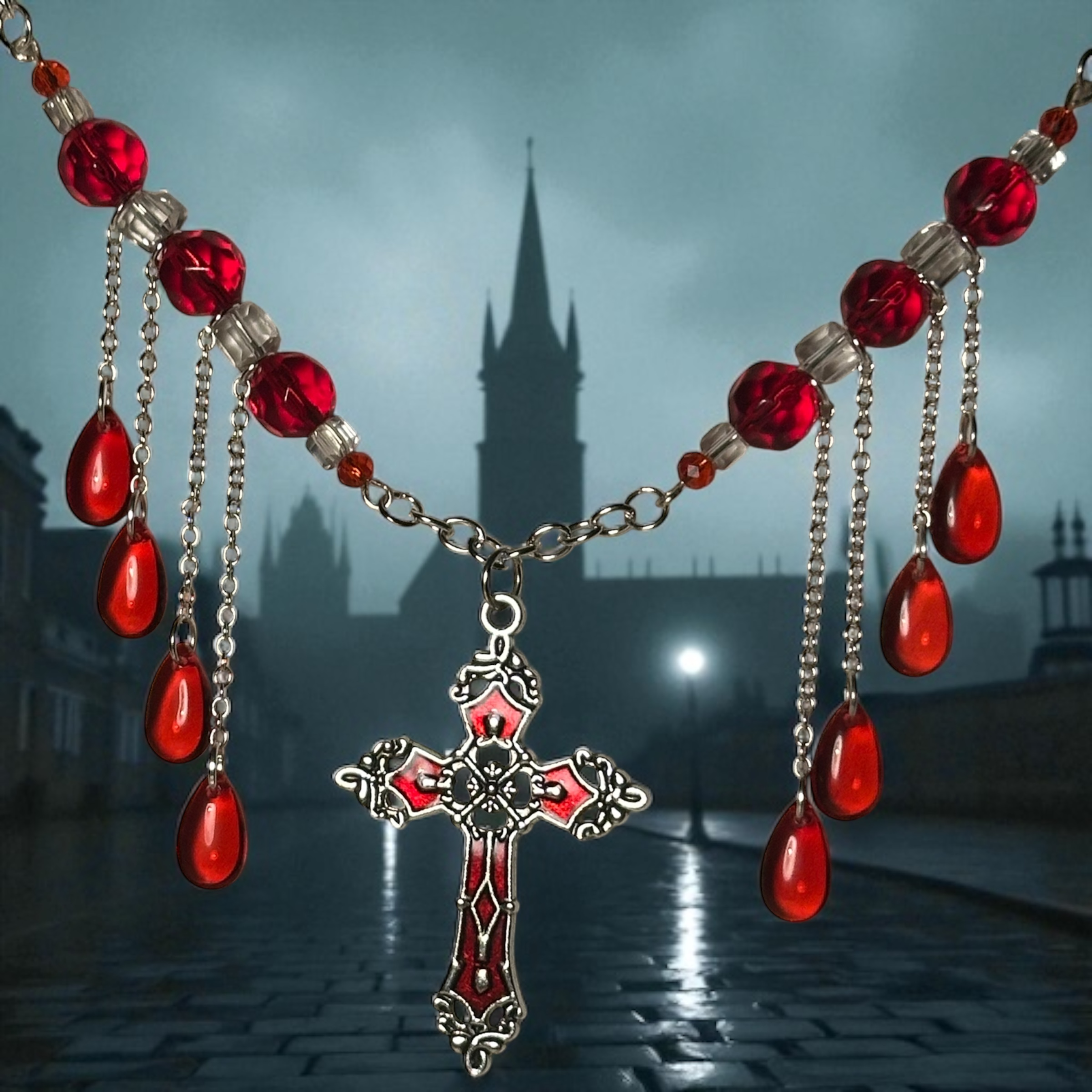 That which is bound in blood is never truly lost, and you will whisper of relics passed through hands long buried when you step into the night adorned in this. The Blood Sacrament necklace is your whisper made real. Red and clear glass beads shimmer like secrets in candlelight, and crimson drops fall like bloody memories too heavy to hold. The cross at its center watches and remembers. Be the whisper. Be the relic, Be The Blood Sacrament.