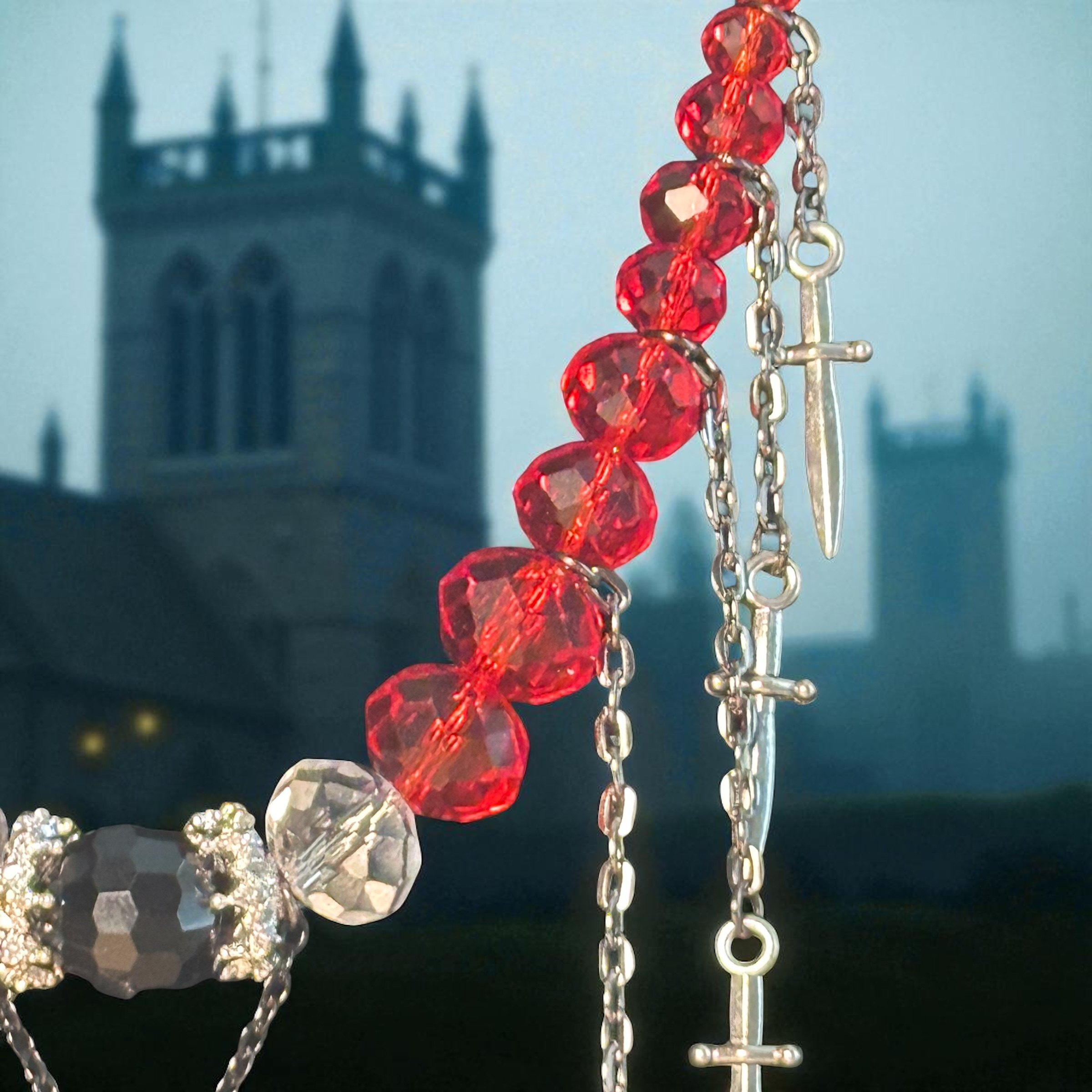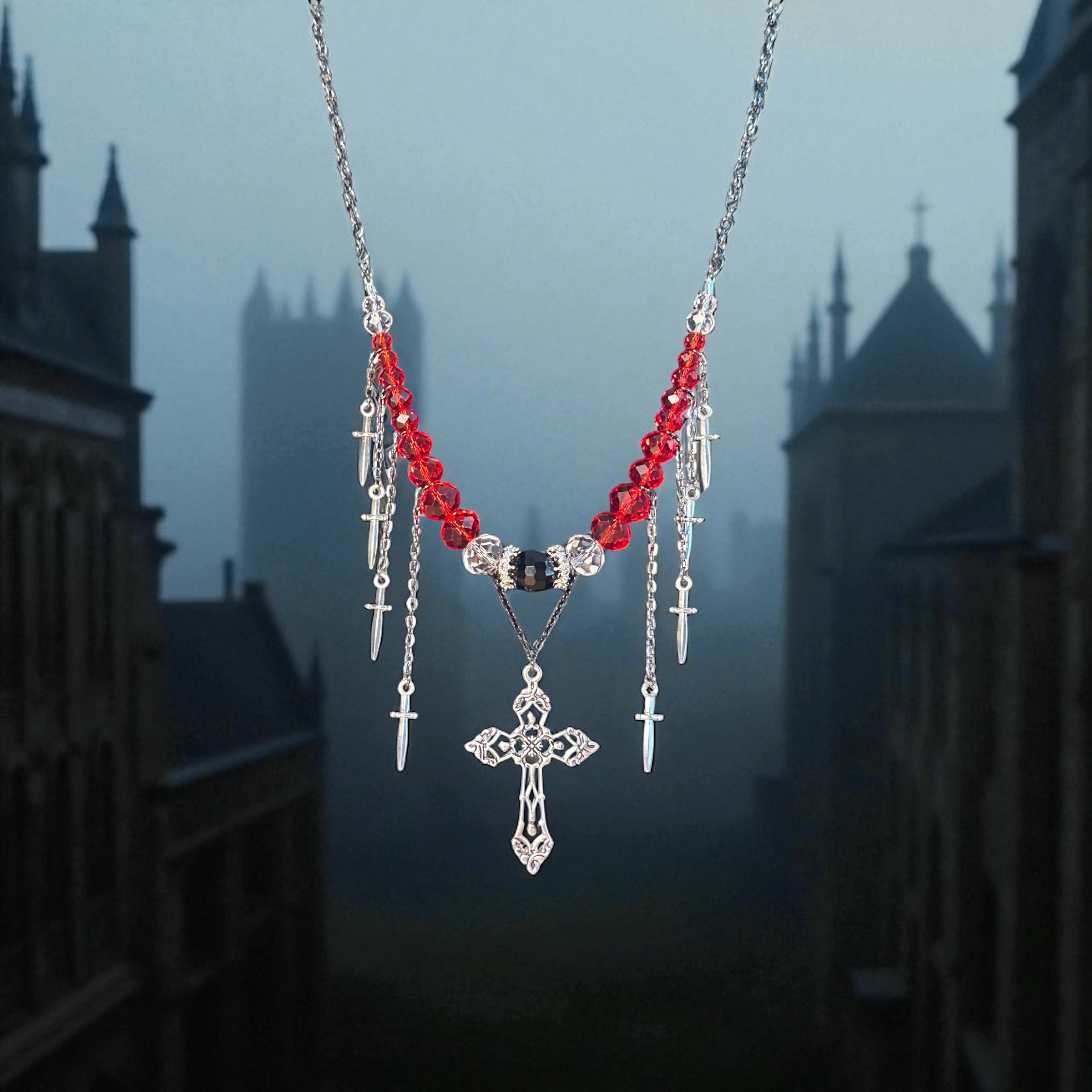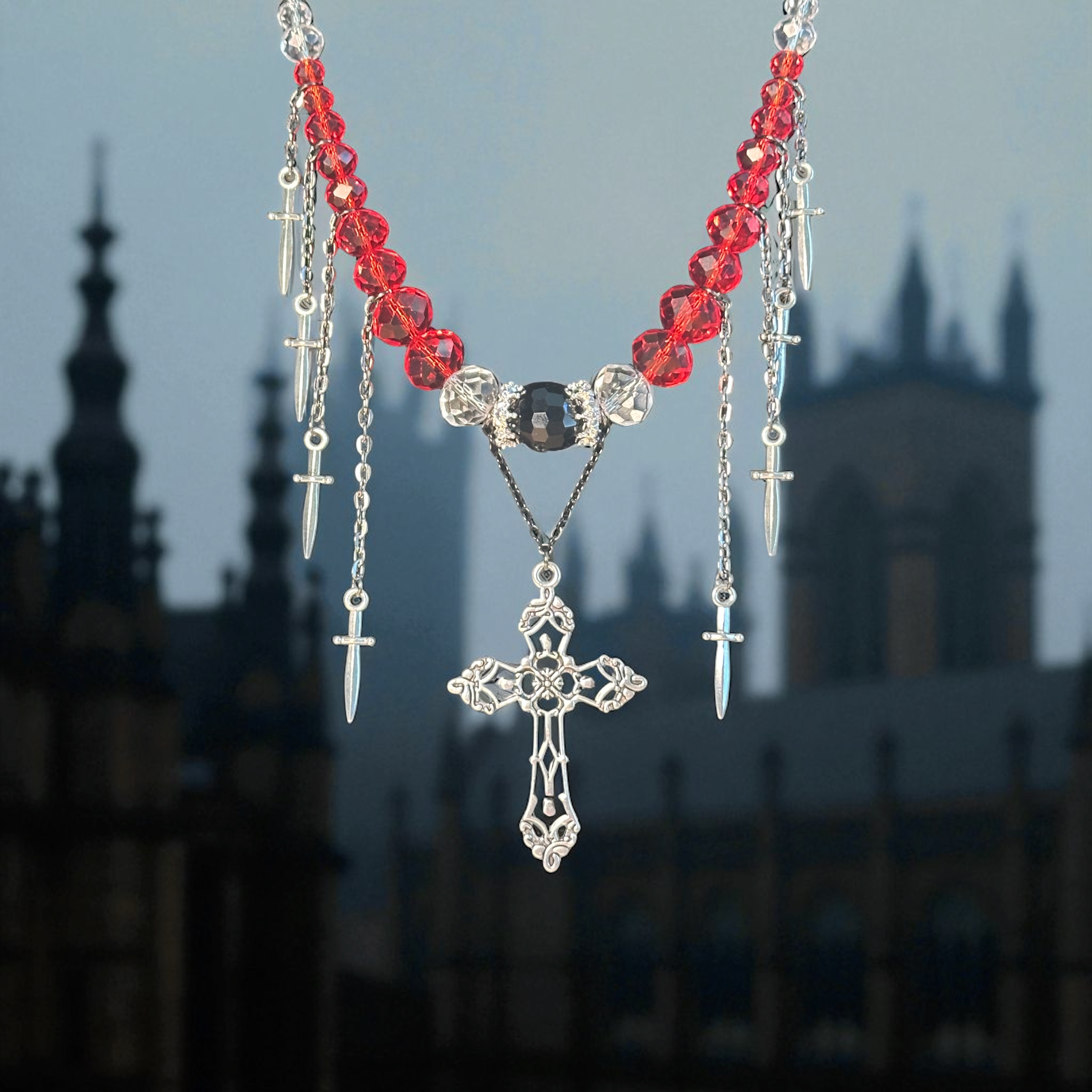 The night was made for you, you were made for the night, and it is the blood that binds the two of you.  Savor every kiss of the shadows in this stunning necklace. Draped in blood and crystal beads, it is adorned with 8 dagger blades that turn the weak away. At its center, a single black crystal suspended in a talon-like cage as it casts its darkness over an ornate gothic cross.