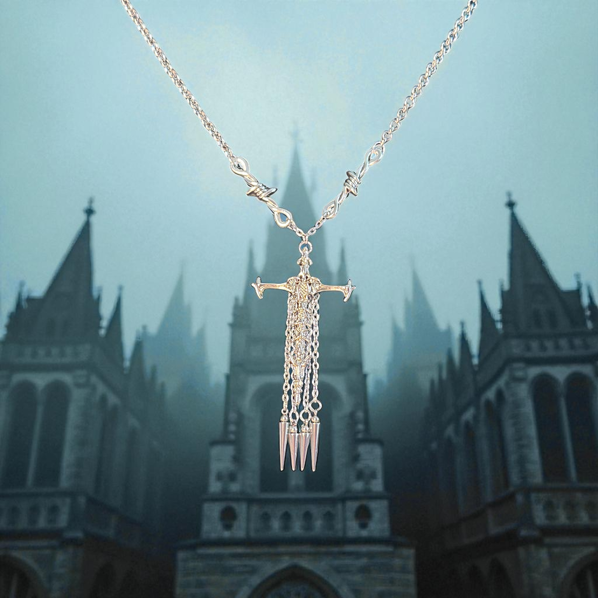 Unleash the dark elegance within. This gothic necklace fuses raw intensity with intricate artistry. Around your neck is a sculpted bone cross, draped in chains that end in dagger-like spikes. More than jewelry, it’s a statement: rebellion forged in silver, devotion sharpened to an edge.