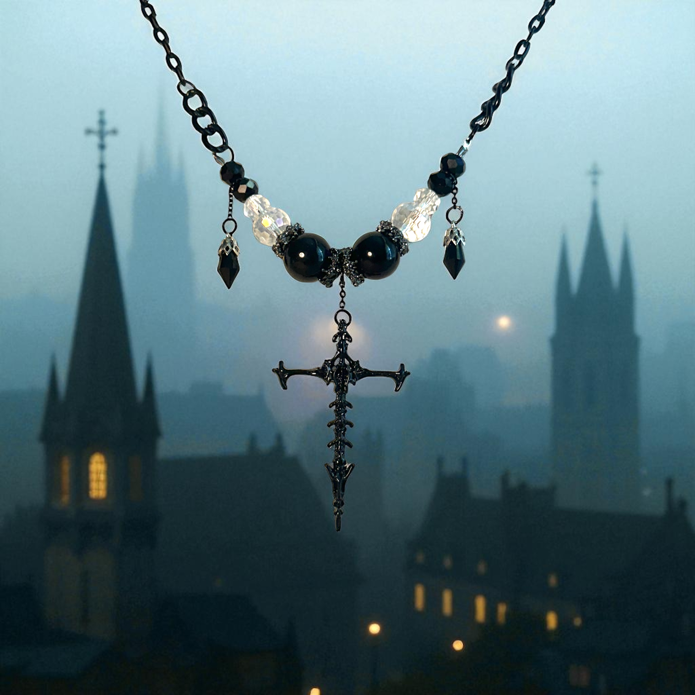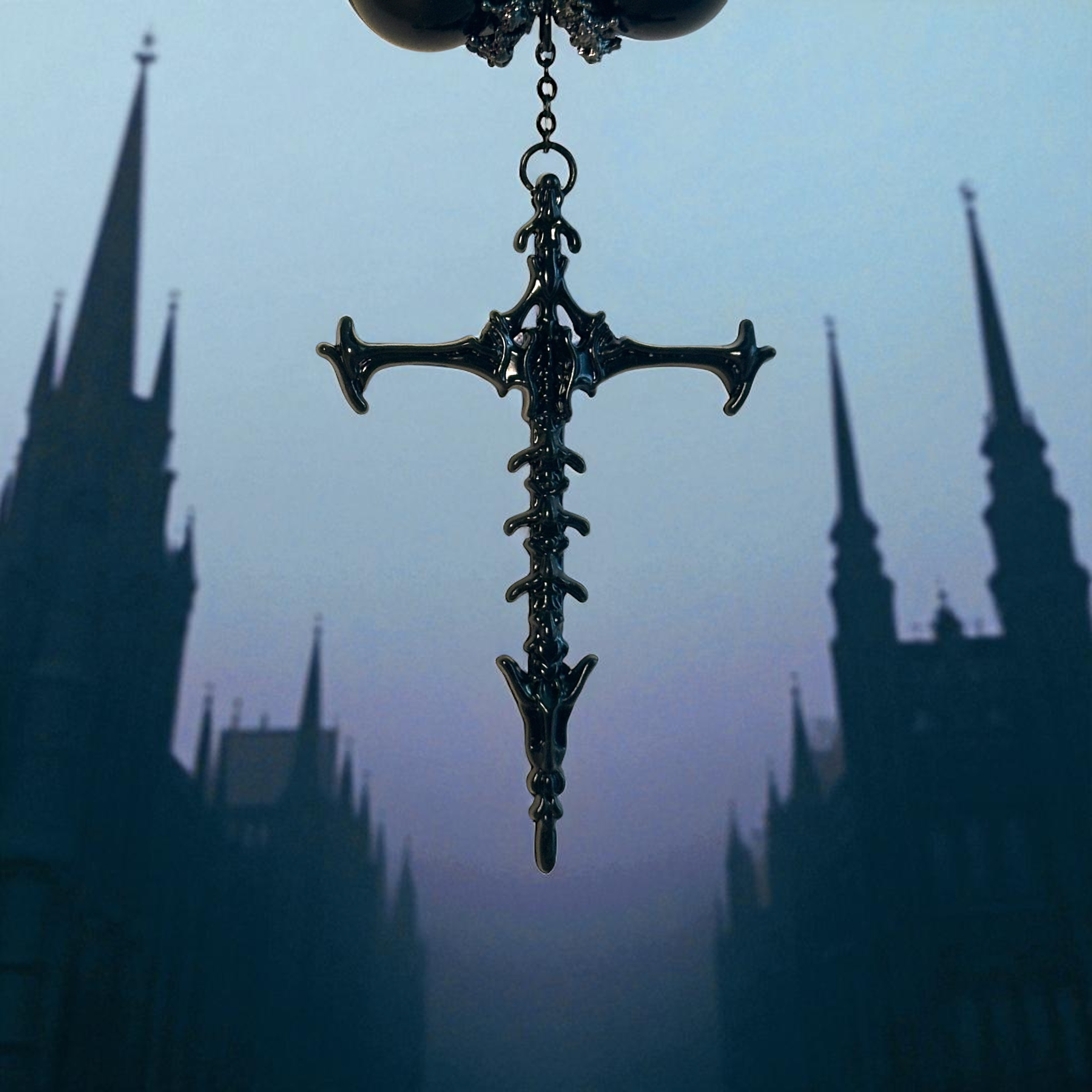 Walk the night and rule it in this handcrafted gothic necklace, Guardian Of The Bones. It features midnight-black beads, crystal accents, and a striking vertebrae cross pendant. Inspired by those who walk the catacombs unseen, this piece is more than jewelry — it’s an eternal vibe for a mortal you.
