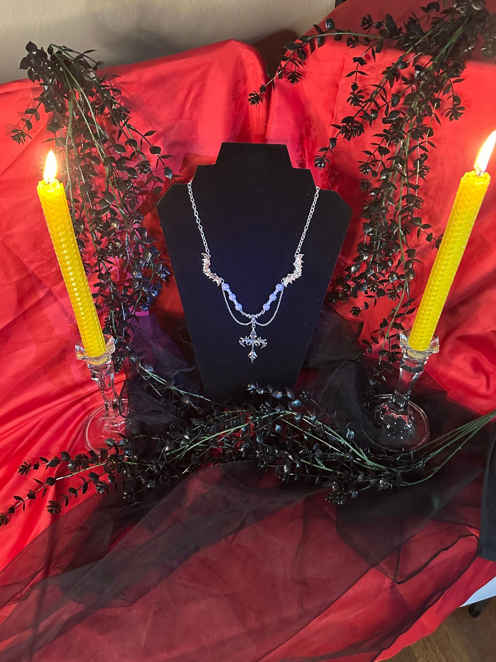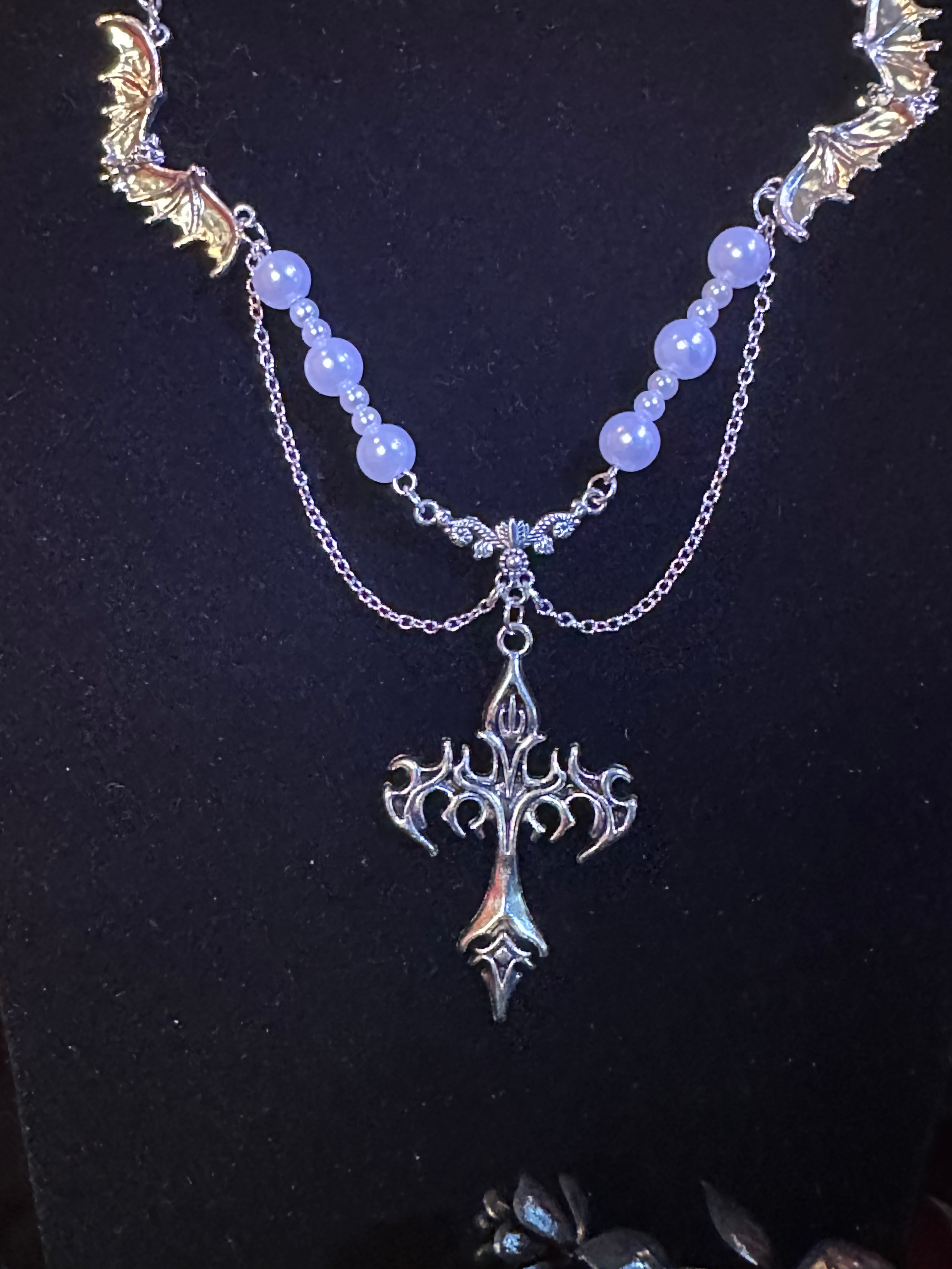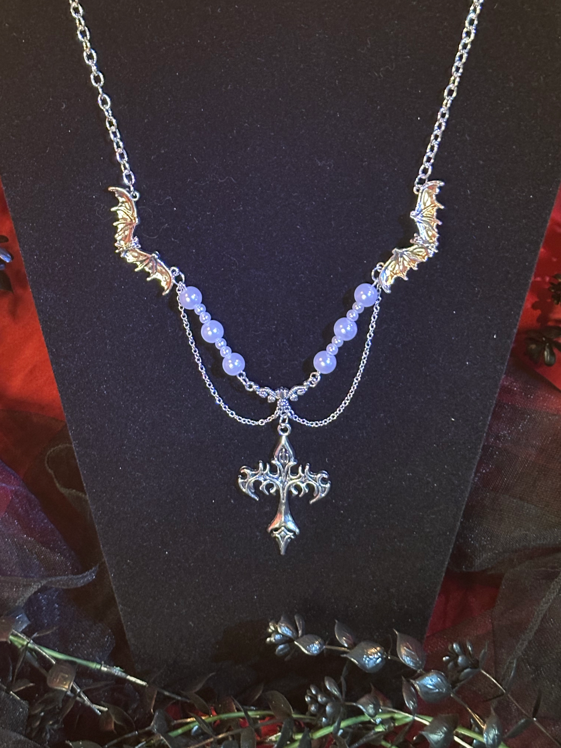 Bound by Night, Crowned in Darkness, this gothic necklace marks your covenant. Silver bats guard the chain like loyal sentinels, while soft pearl accents echo moonlight. At its heart, a blazing razor-edged cross hangs as both weapon and vow. The perfect accessory for creatures who thrive after dusk—vampires embracing their hunger, and romantics adorned with the night.