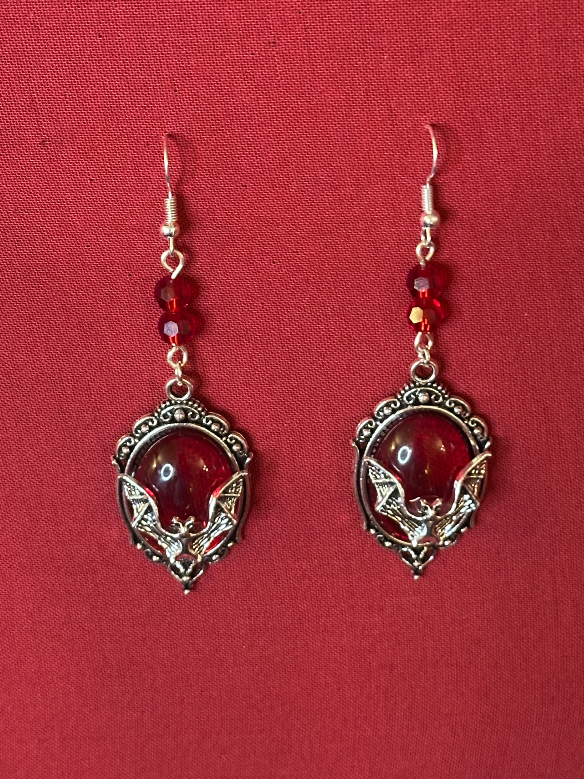Some legends whisper that eternity isn’t given — it’s taken. These elegant, earrings hold that secret close. Available in both opaque black and slightly translucent red, and framed in silver filigree as the bat stretches across the cameo like a creature rising from the dark. Designed for souls who crave more than the ordinary, these earrings are omens and symbols of the power of being bold. Let them whisper what you already suspect: Immortality isn’t a dream, it’s a promise, and it’s calling your name. Made to pair with the “The Promise Of Immortality” necklace.
