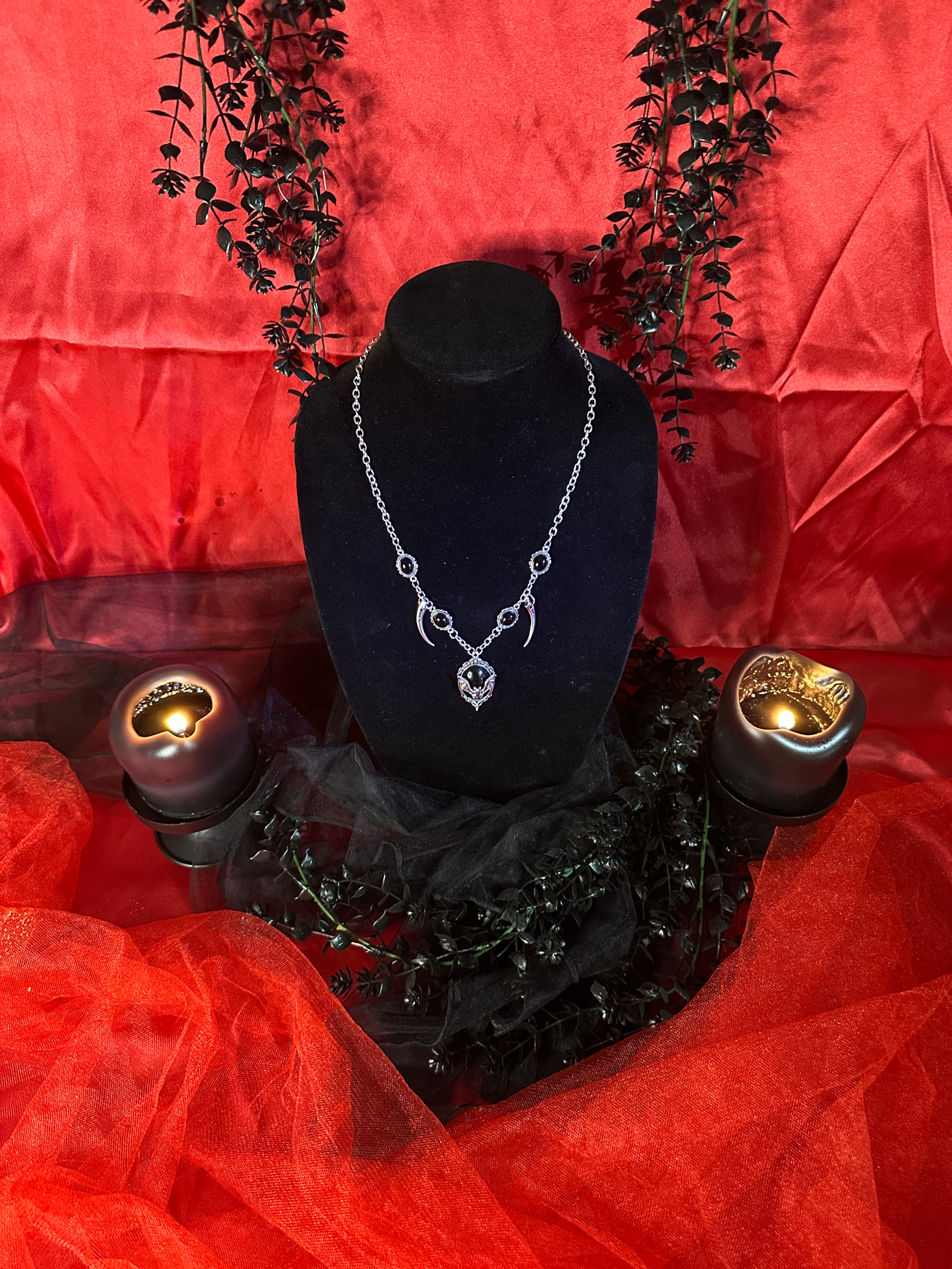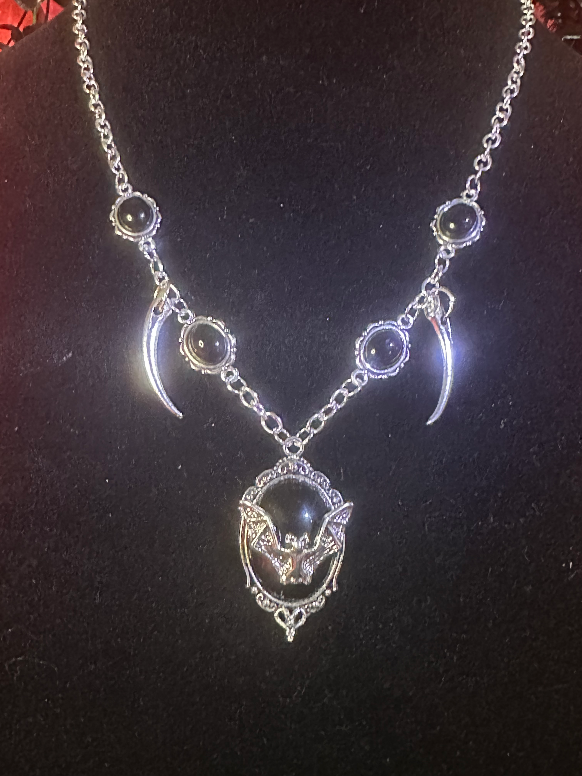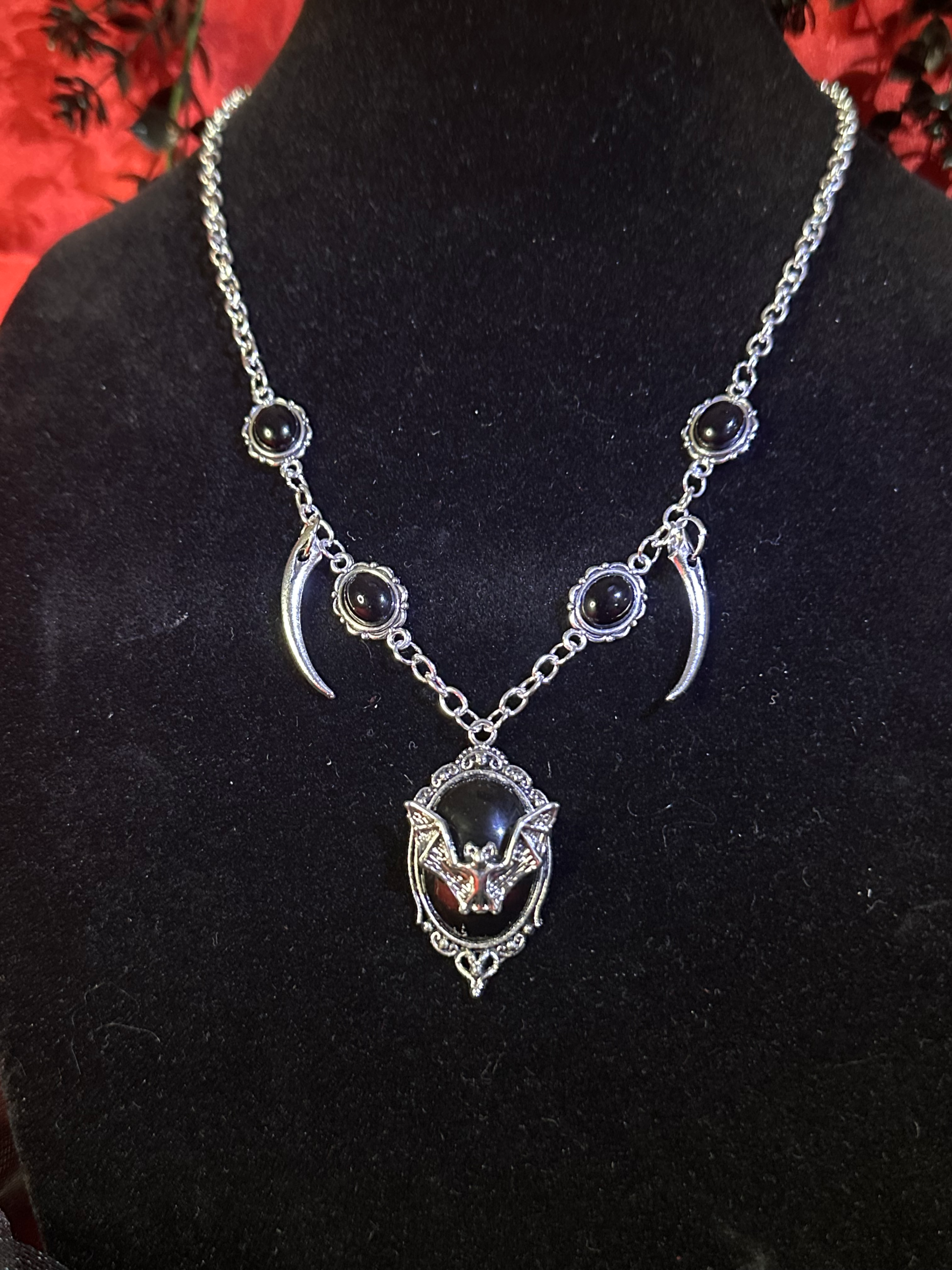 The Promise is yours and you wear it like no one else as you step into your realm of night and shadow. This beautiful gothic necklace features 4 obsidian charms surrounding 2 long and luscious vampire fangs. All guarding a dark, black and silver bat pendant; the sigil of your immortal desire.